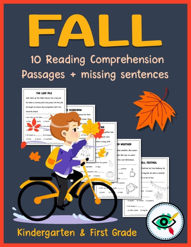 Spark your child’s love for reading and critical thinking this fall with our tailored package of 10 fall reading comprehension passages. Designed explicitly for children in kindergarten and first grade, these fun, printable worksheets not only nurture reading skills but also foster critical thinking through our unique “missing sentence” feature..