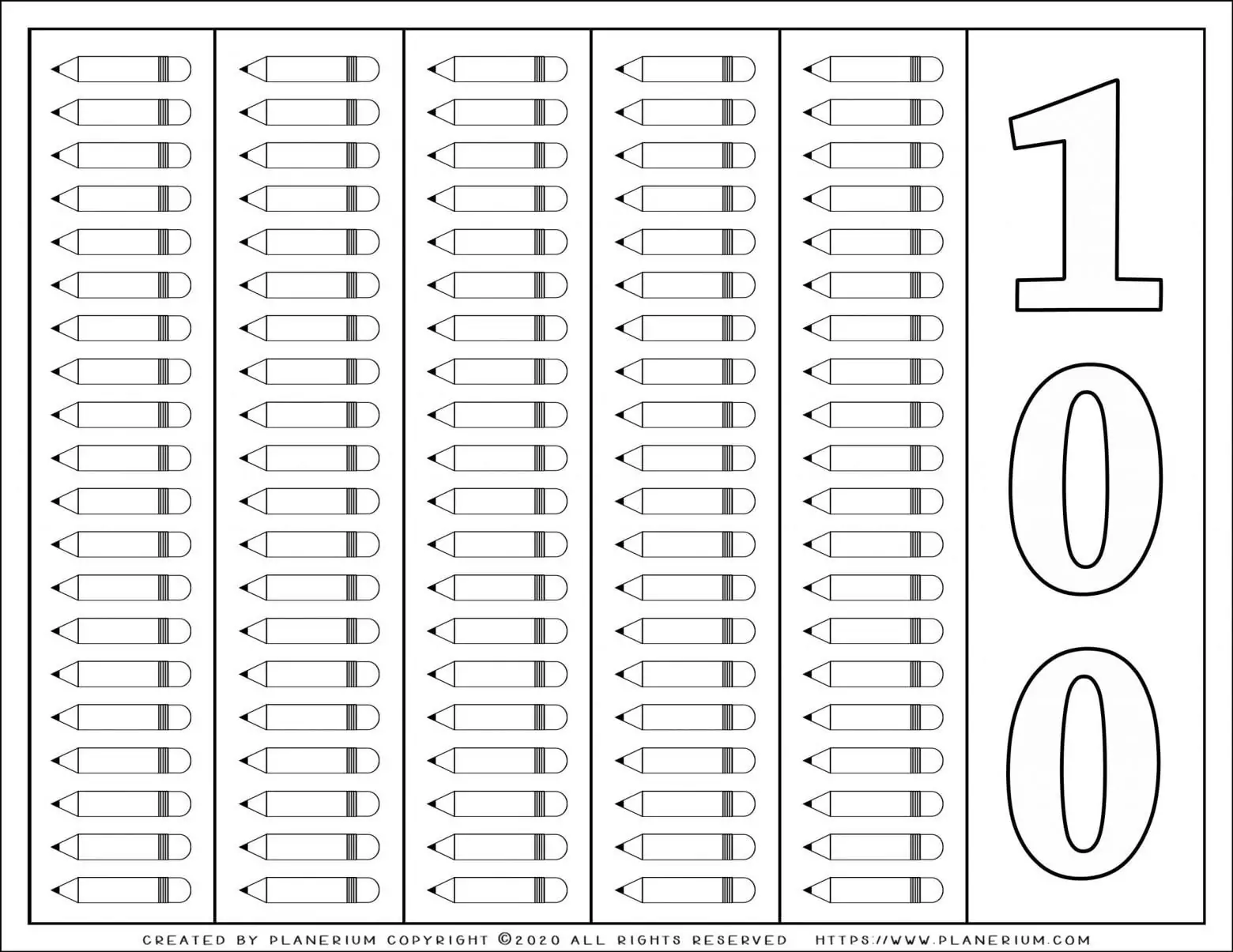 - Big bold “100” number outline with 100 pencil outlines to color