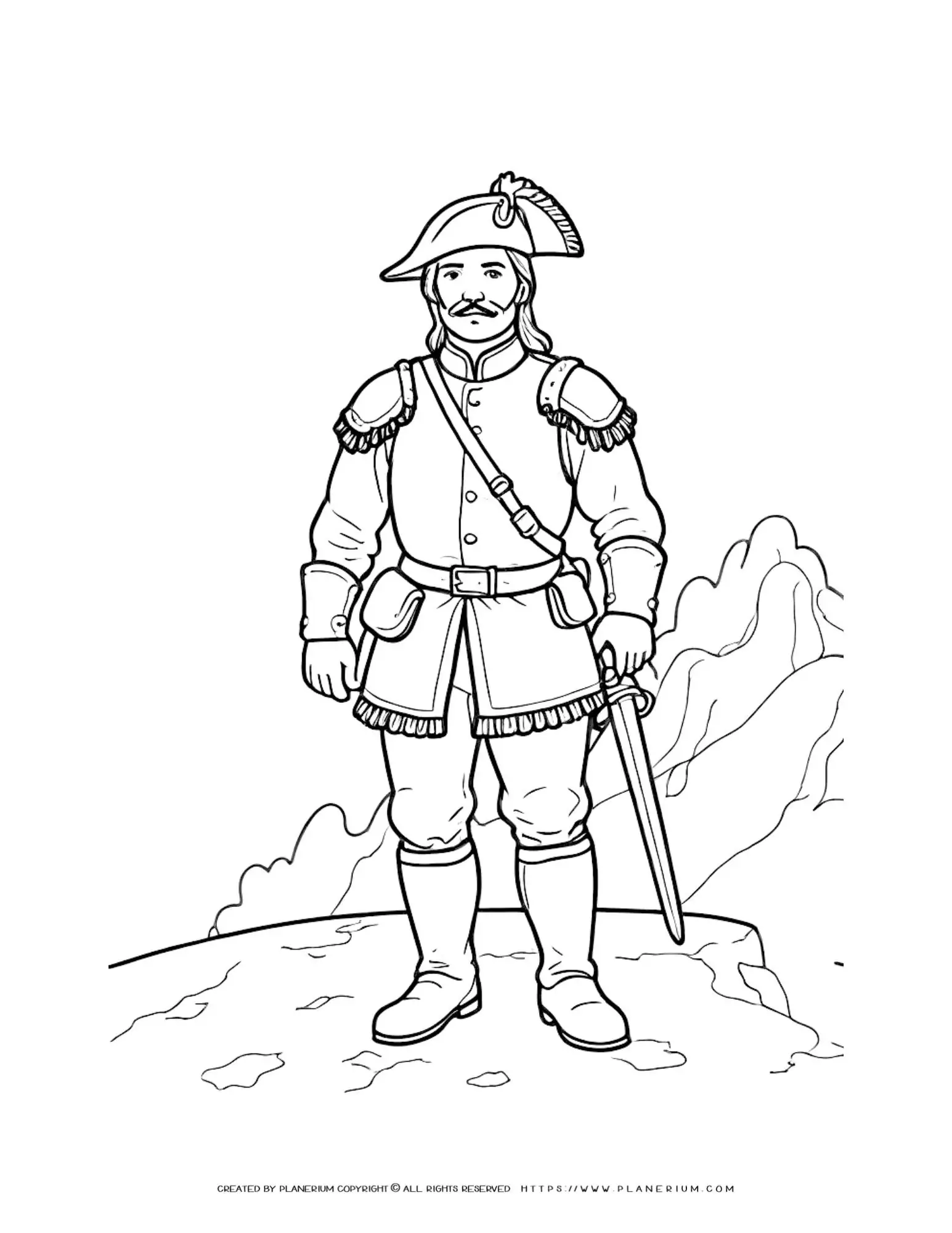 This unique coloring page features a detailed illustration of an 18th-century soldier in a period military uniform, posed valiantly on rocky terrain. Whether you’re a teacher, parent, homeschooler, or adult learner, you’ll find this activity both educational and rewarding.