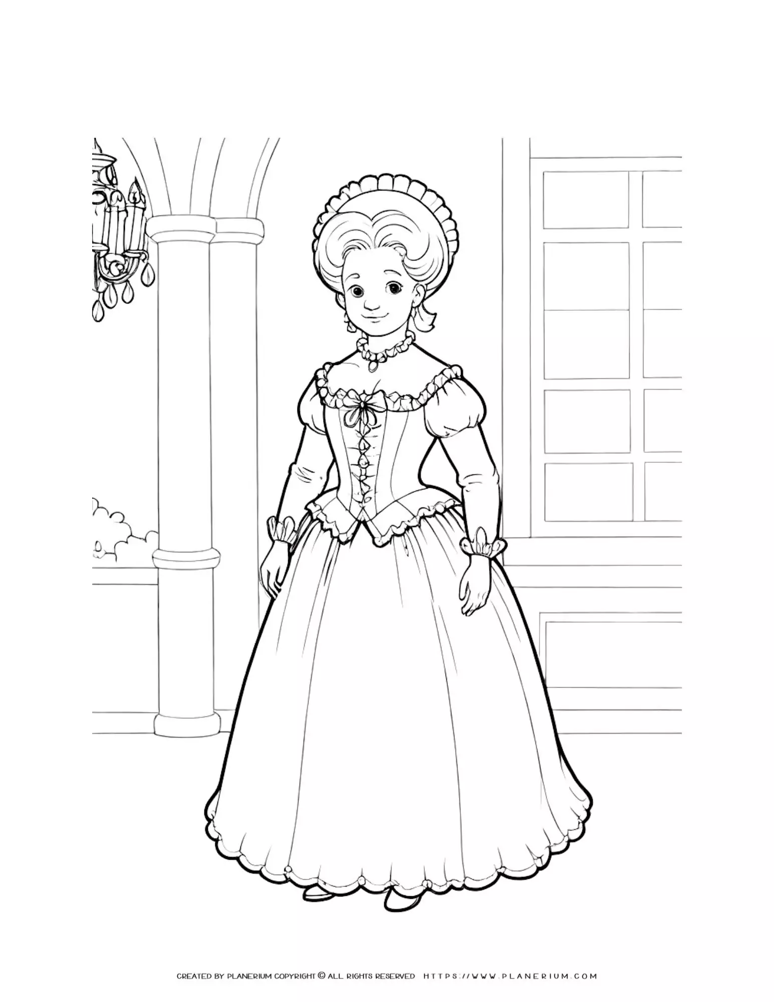 18th Century Woman in Ball Gown with Palace Interior – Historical Illustration Coloring Page