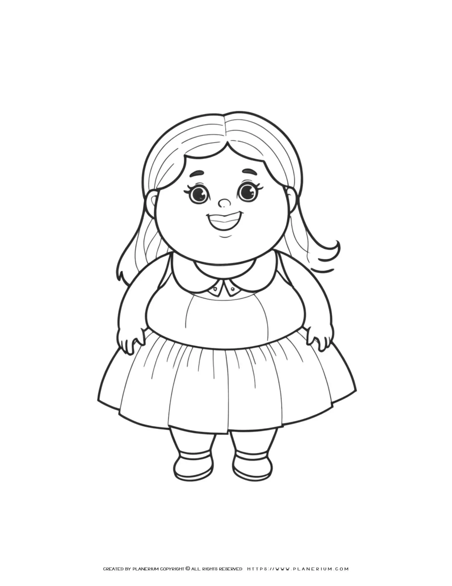This coloring page display a happy fat girl with a dress. Perfect for teachers, parents, and homeschoolers looking for a simple yet effective way to captivate children’s imagination while aiding their development. 🌟