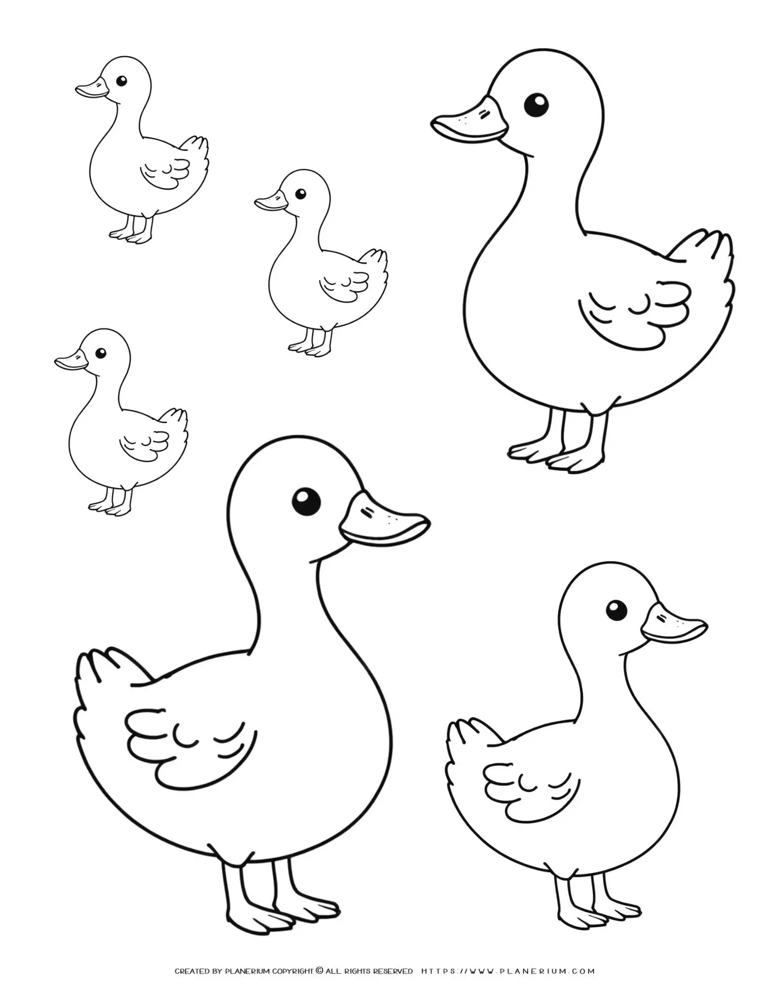 Adorable Six Duck Outlines Coloring Page for Kids – Fun Family of Ducks Facing Left & Right Printable Activity