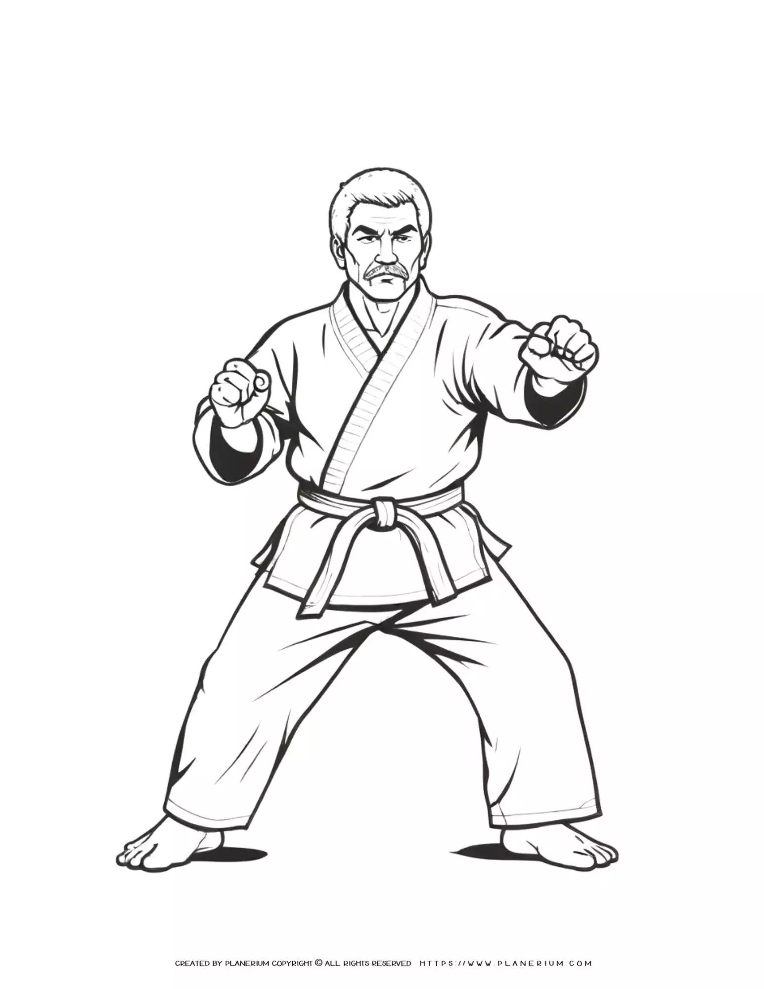 Adult Man in a Karate Fight Stance Illustration Coloring Page for Kids and Martial Arts Enthusiasts