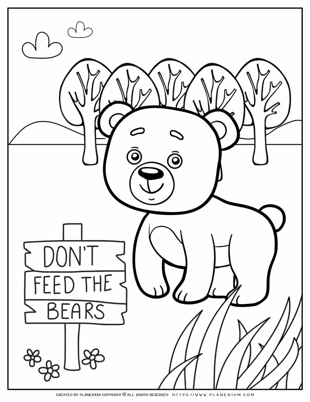 Fun coloring page for kids with a smiling bear and a sign don’t feed the bears.