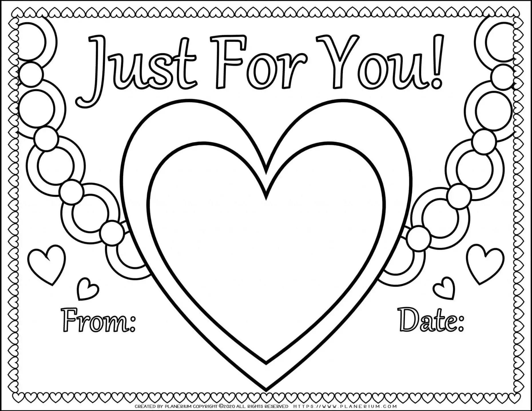 Large Heart Necklace coloring page with a matching foldable “Just for You!” greeting card for classroom or homeschool students includes a color-and-cut heart necklace, a foldable lined greeting-card space with guided writing prompts, and wearing the finished necklace as a keepsake. Supports handwriting and short-message composition, fine-motor control, and expressing appreciation.
