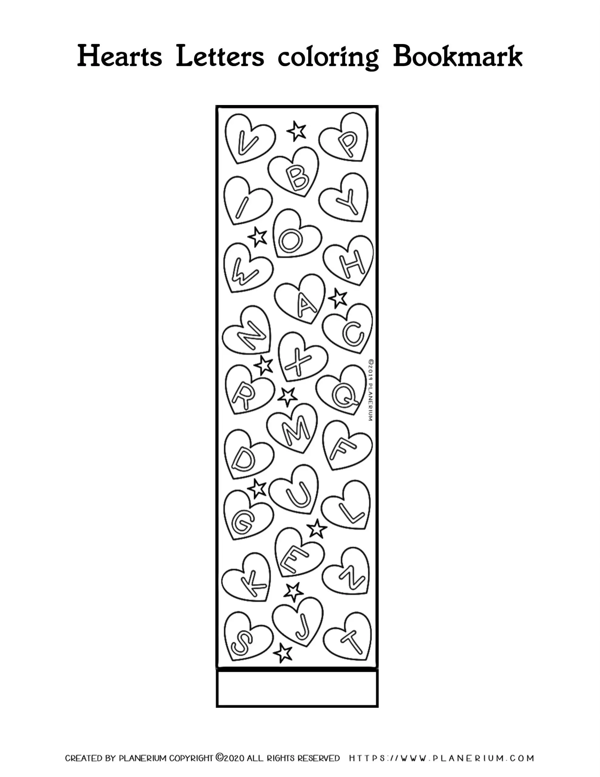 Free Kids coloring bookmark for valentine’s day with hearts and letters.