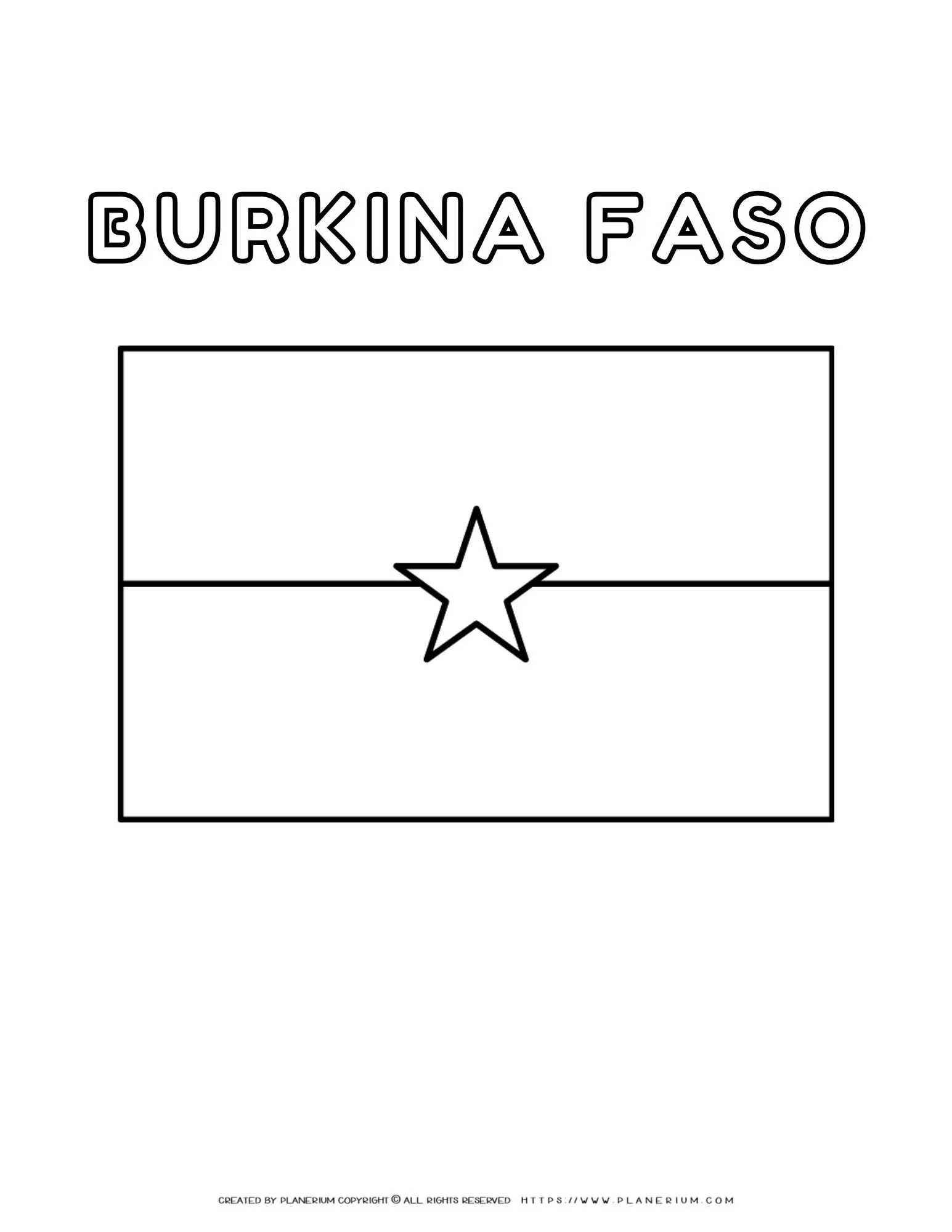 Discover the vibrant culture and history of Burkina Faso with our Burkina Faso flag coloring page. Burkina Faso, a captivating country situated in West Africa, is rich in cultural heritage and historical significance. The national flag of Burkina Faso, adopted in 1984, features two horizontal bands of red and green with a yellow star centered in the upper red band. This design reflects the country’s prosperity, peaceful struggle for independence, and hope for a brighter future. Learn more about Burkina Faso on Wikipedia.