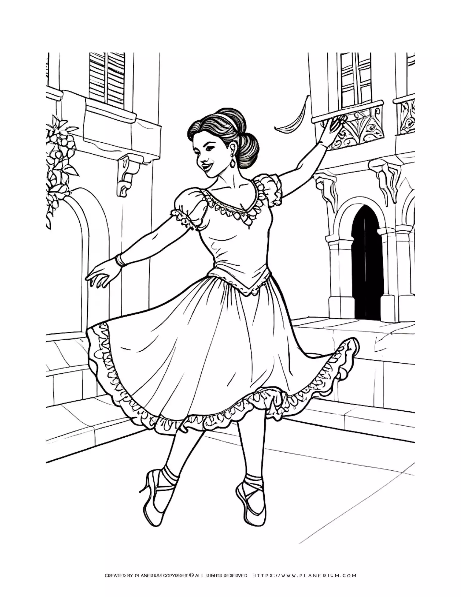 Captivating Spanish Woman Dancing in the Streets Coloring Page | Intricate & Celebratory Design for Artful Relaxation