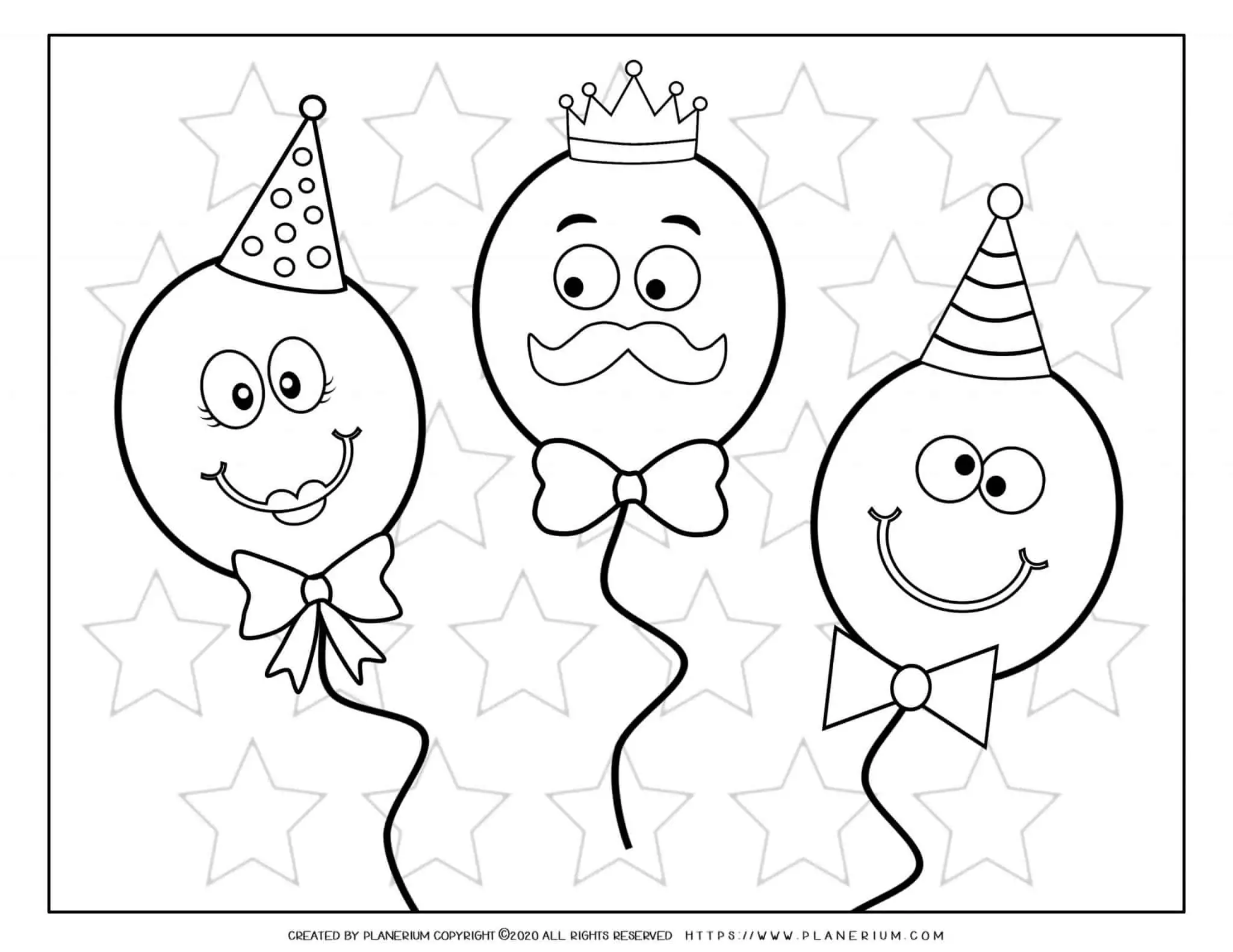 Carnival Balloon Faces coloring page for students in the classroom or homeschool features balloon faces with bows, crowns, and hats for coloring; includes coloring within the lines, creating repeating patterns and distinct color schemes, and producing themed pieces for classroom decorations or greeting cards to build fine motor control and color-choice skills.