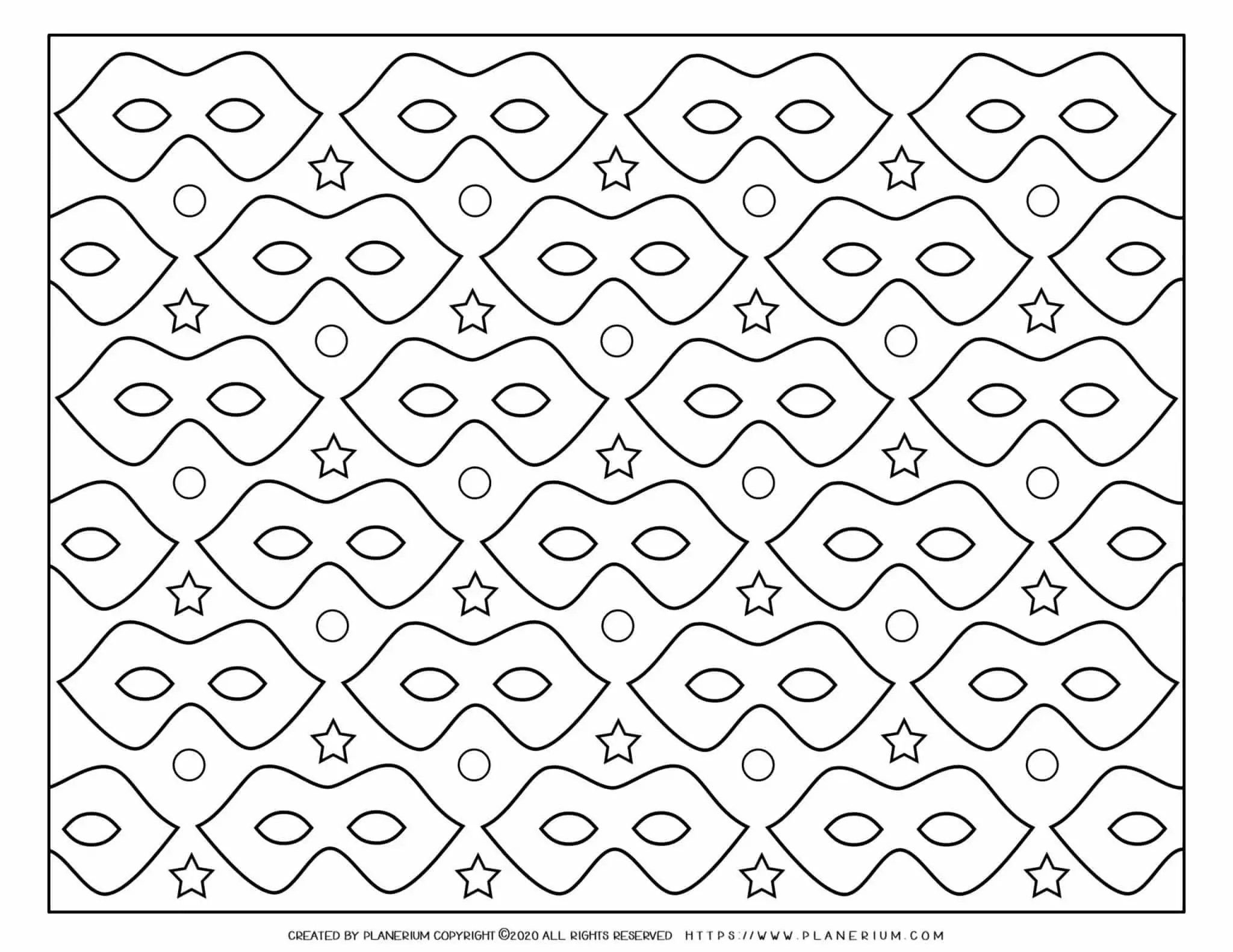 Use this Carnival Masks coloring page to focus student practice on decorative patterning and deliberate color choices while they work through a sheet filled with carnival masks and circle or star accents; it also gives you finished artwork that can be displayed as classroom decorations, posters, or turned into a simple greeting card.