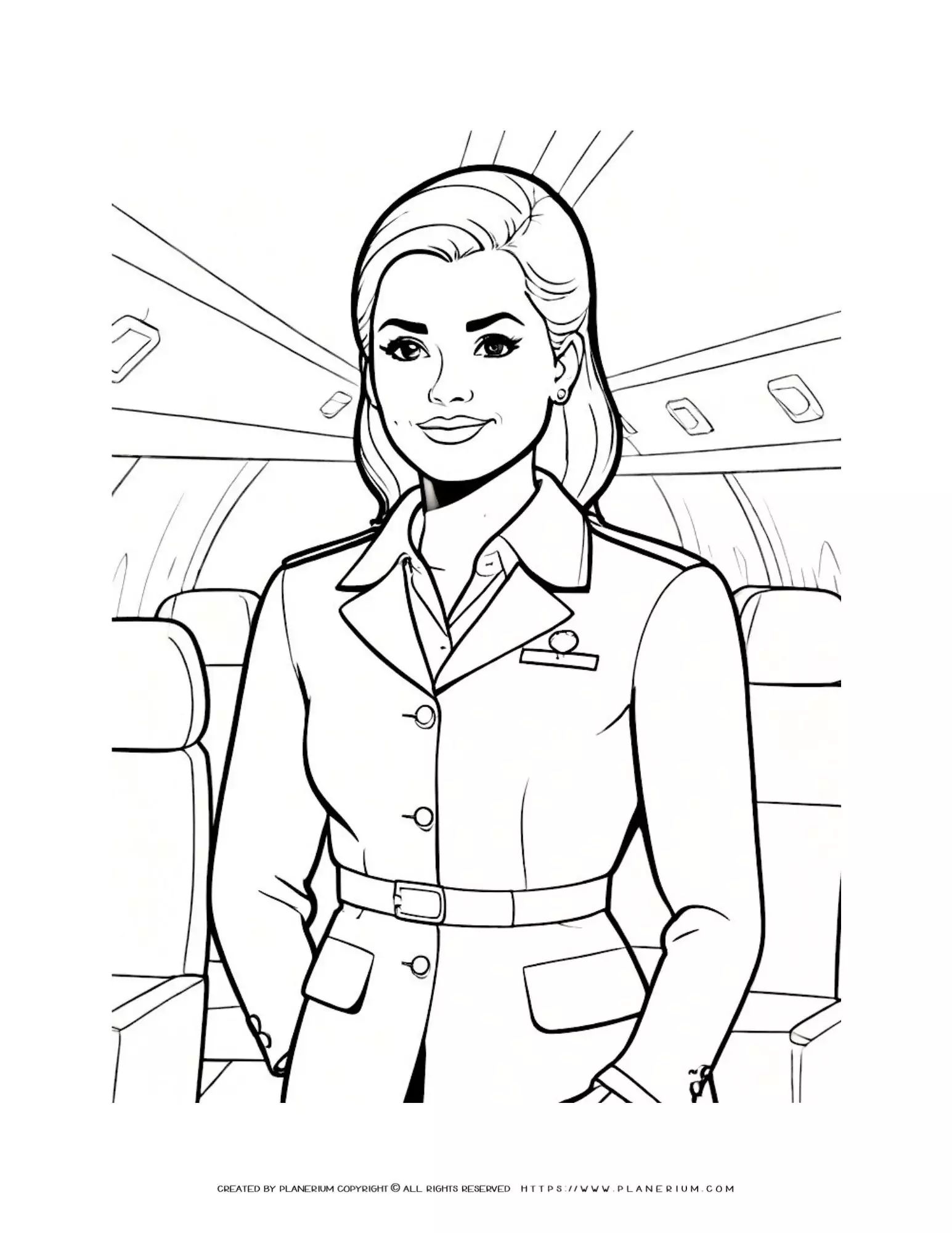 The illustration features a friendly and professional flight attendant inside an airplane, providing an excellent opportunity for learners to dive into the aviation world while honing essential skills. Whether in the classroom, at home, or as a relaxing personal activity, this coloring page fits seamlessly into any learning environment.