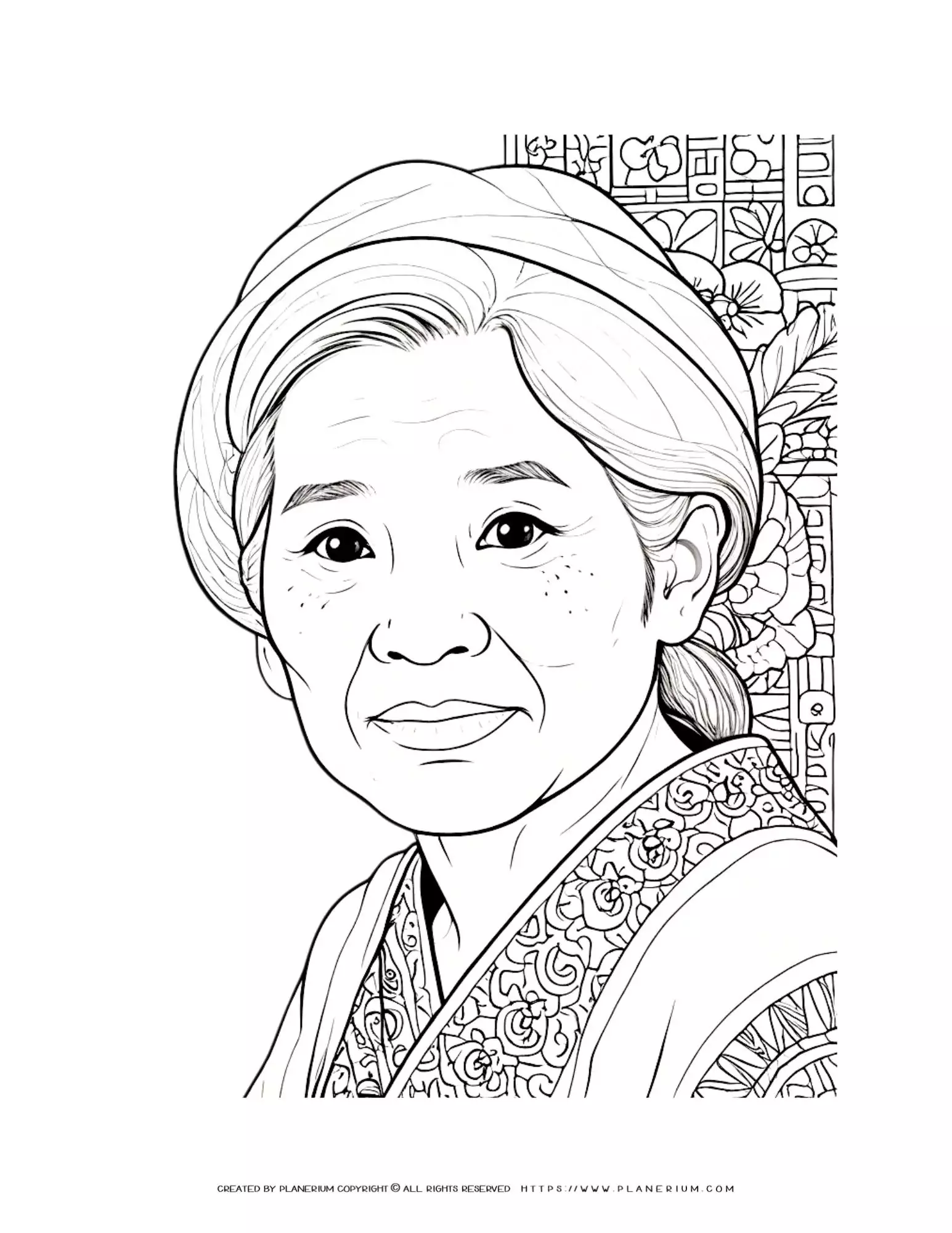 Whether you are a teacher looking to add cultural depth to your classroom, a parent eager to introduce your child to new cultures, or an adult seeking a relaxing creative outlet, this Asian Old Lady Portrait Coloring Page delivers educational and personal enrichment.