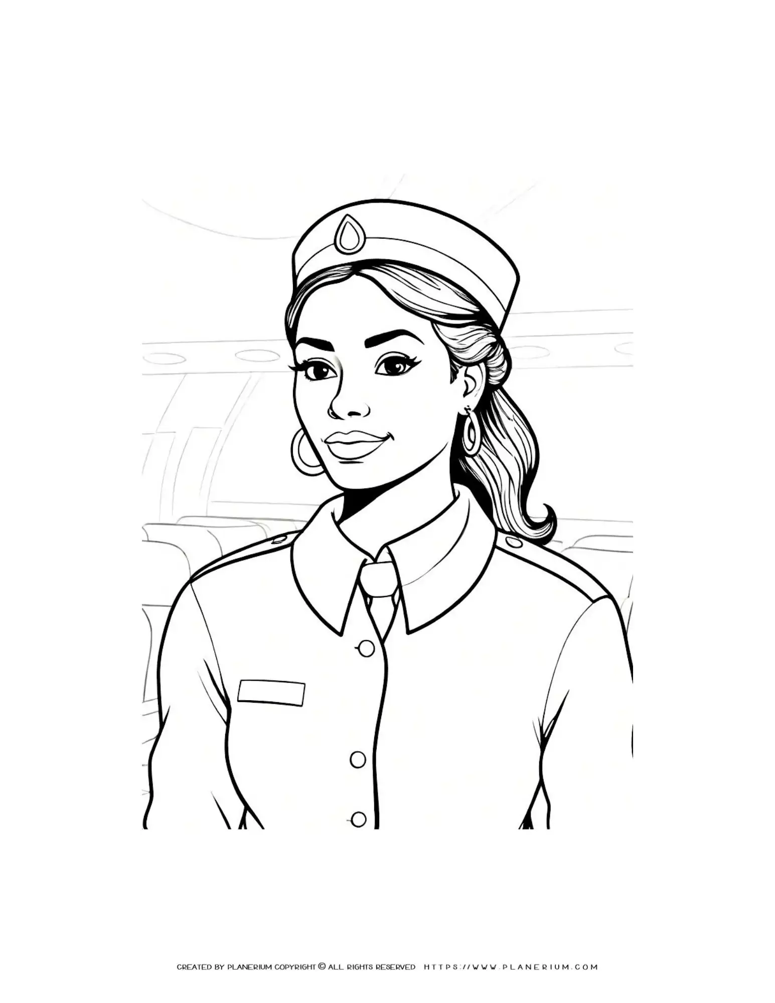 Coloring Sheet of a Comic Flight Attendant Portrait Inside an Airplane