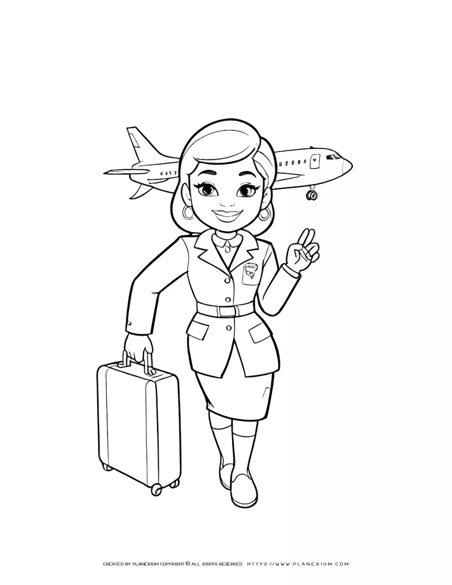 Comic Flight Attendant Woman Standing with Suitcase and Flying Airplane in the Background