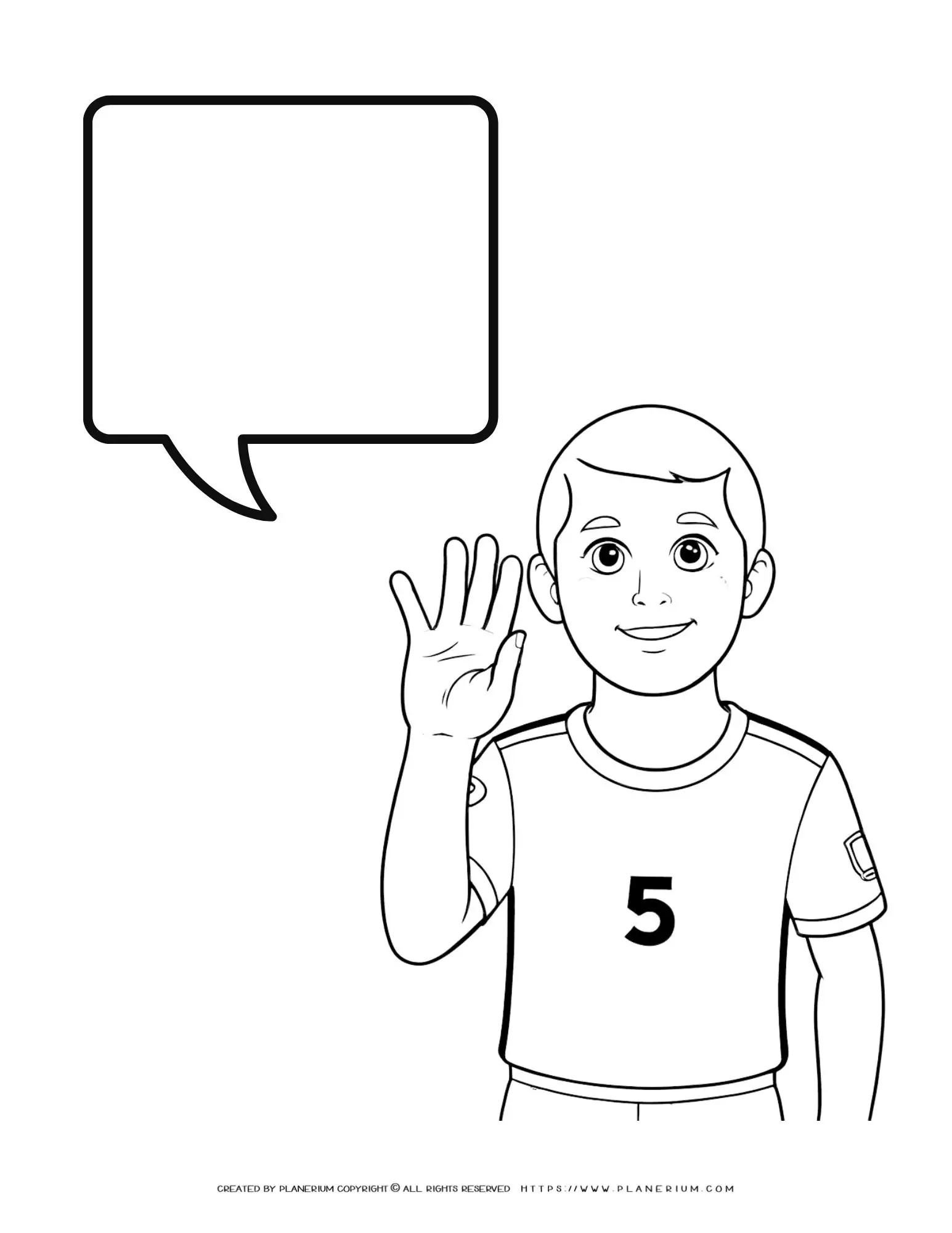 Comic Soccer Boy Player Raising Hand with Speech Bubble Outlines