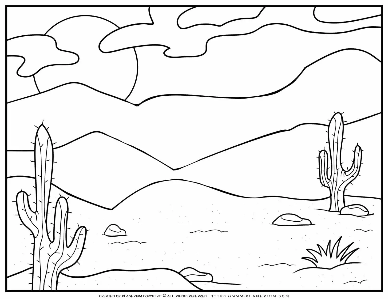 Coloring page with a desert view, mountains, rocks, and cacti.
