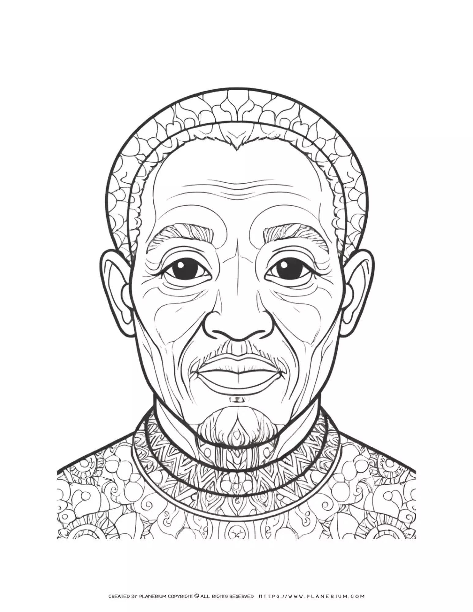 Meet the coloring page featuring a detailed front view portrait illustration of an African old male. This educational printable is perfect for teachers, parents, homeschoolers, special educators, and adult learners who are looking to enrich their learning experiences with an engaging activity.