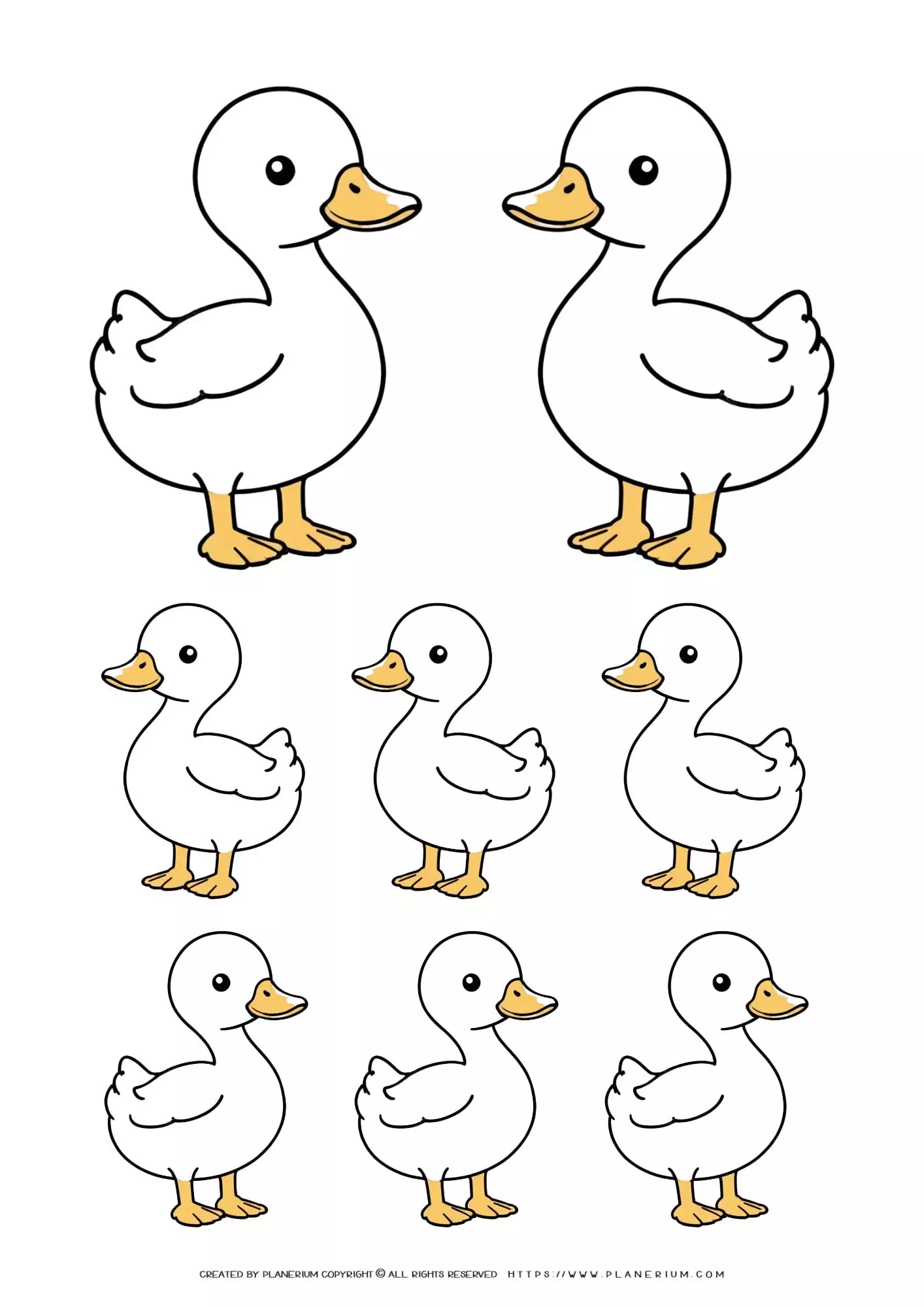 Matching Game: Print out multiple copies and cut out the ducks for a fun matching game! Kids can match the big ducks with their ducklings or have them all swim together in various configurations.