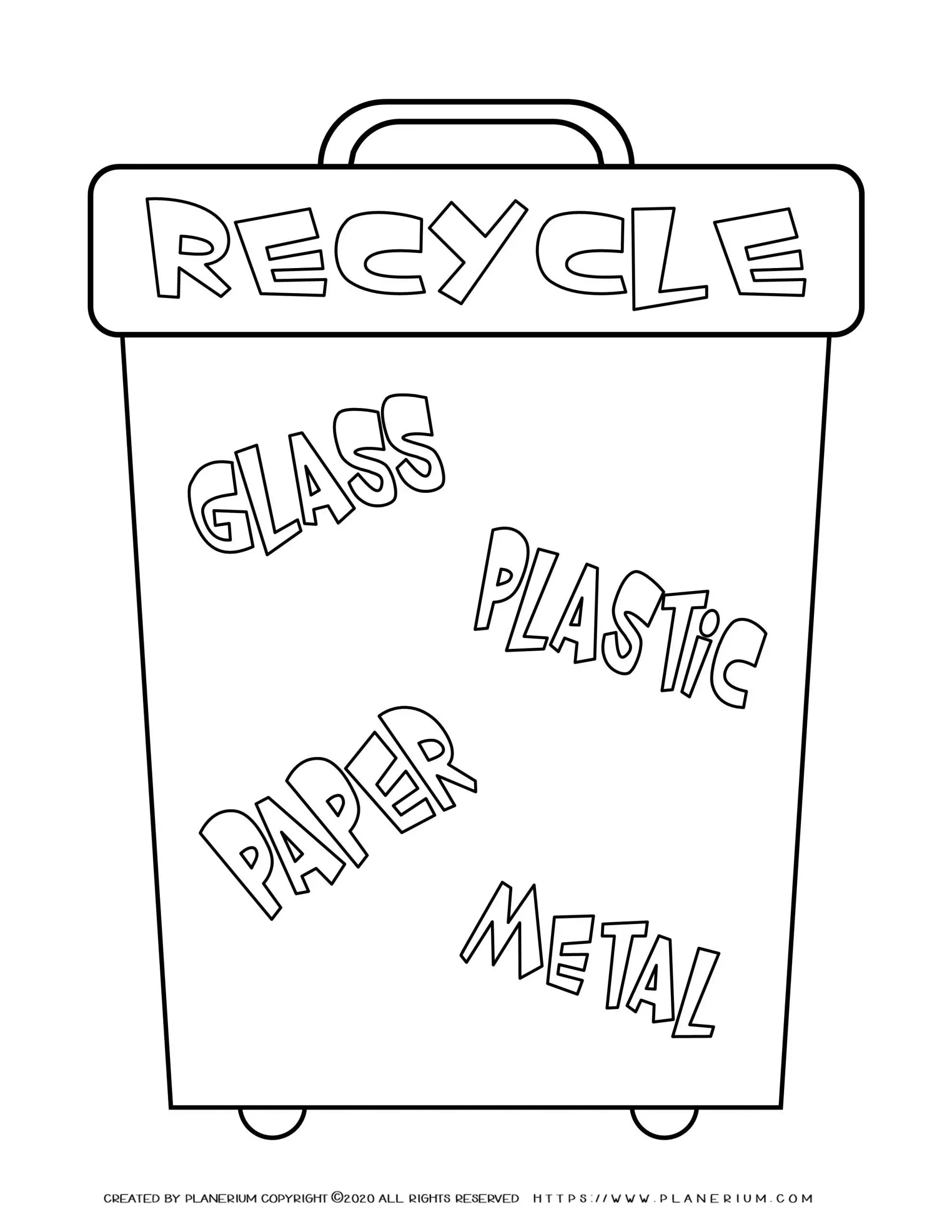 This coloring-page focuses on key recycle vocabulary inside a friendly recycle-bin illustration. Main features: