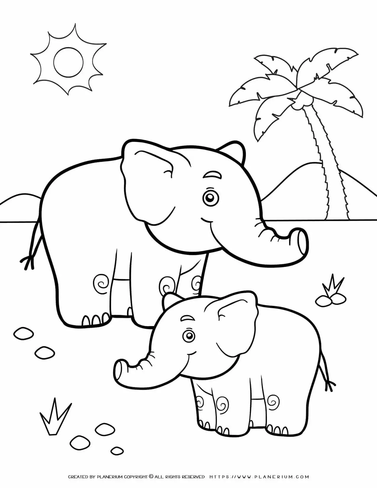 Elephants Coloring page for kids including two elephants, a mother, and a child.