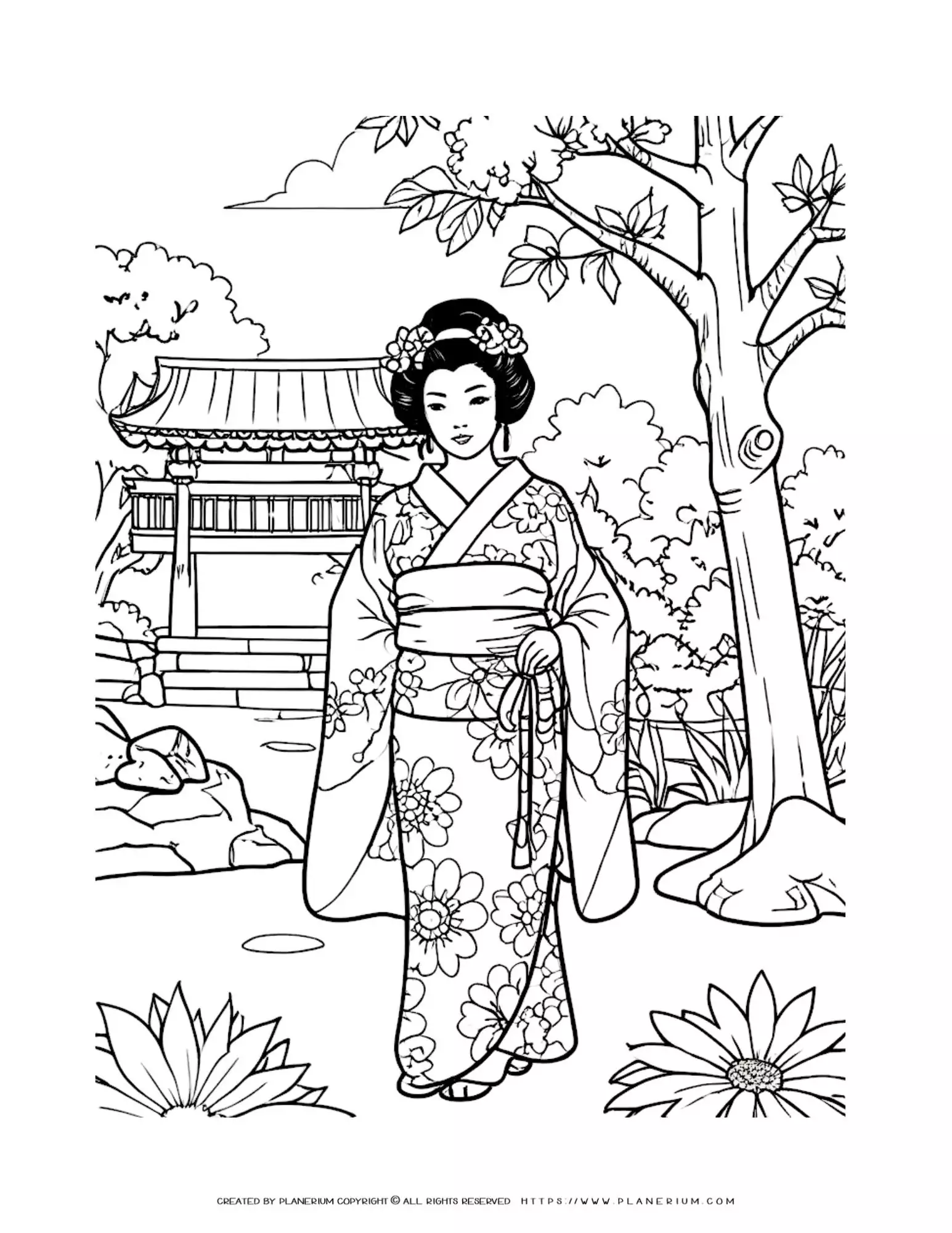 Enchanting Geisha Strolling in a Japanese Garden Coloring Page – Intricate Adult Coloring Book Art for Mindful Relaxation