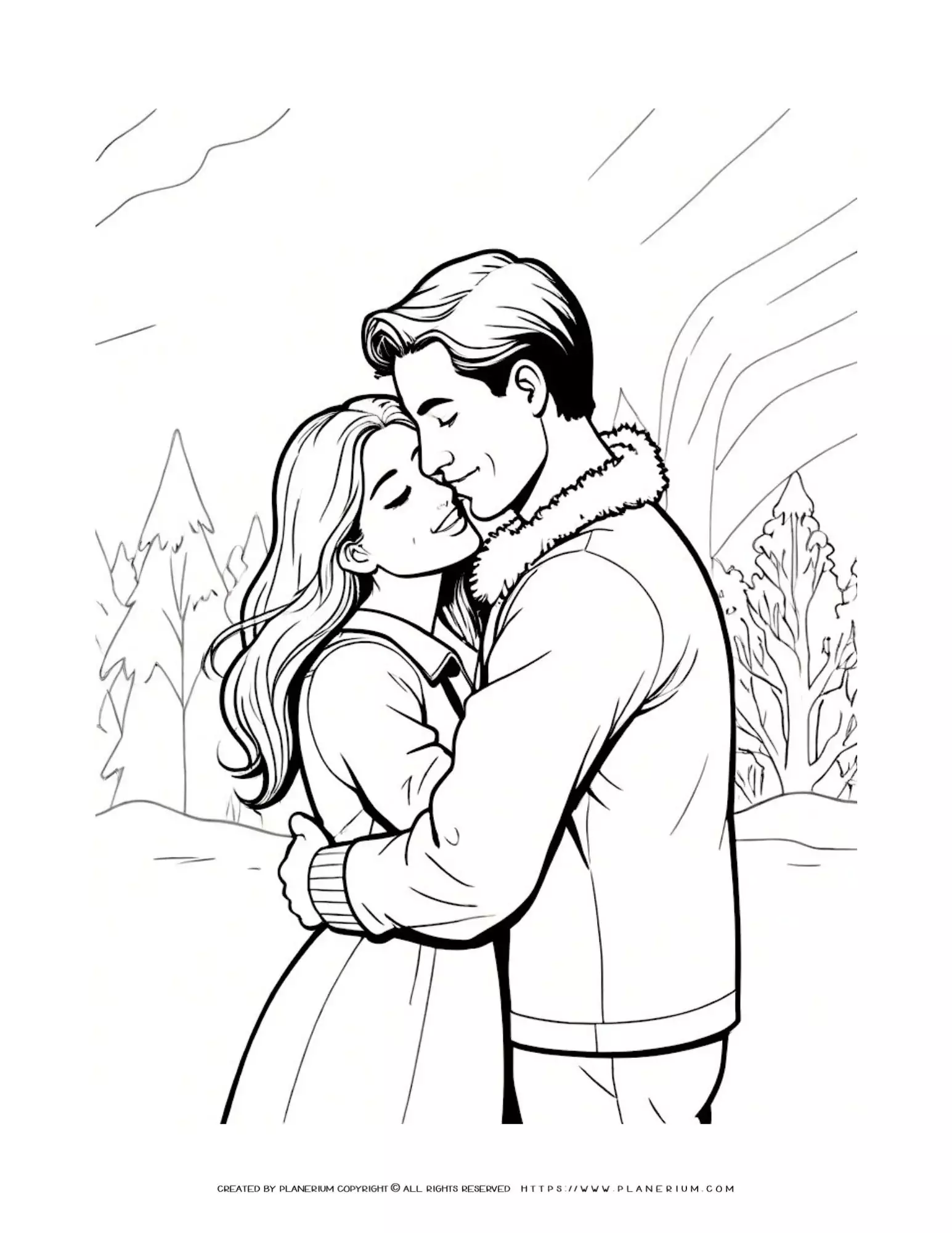 Enchanting Winter Romance: Couple Embracing in Snowy Forest – Premium Coloring Page for Adults