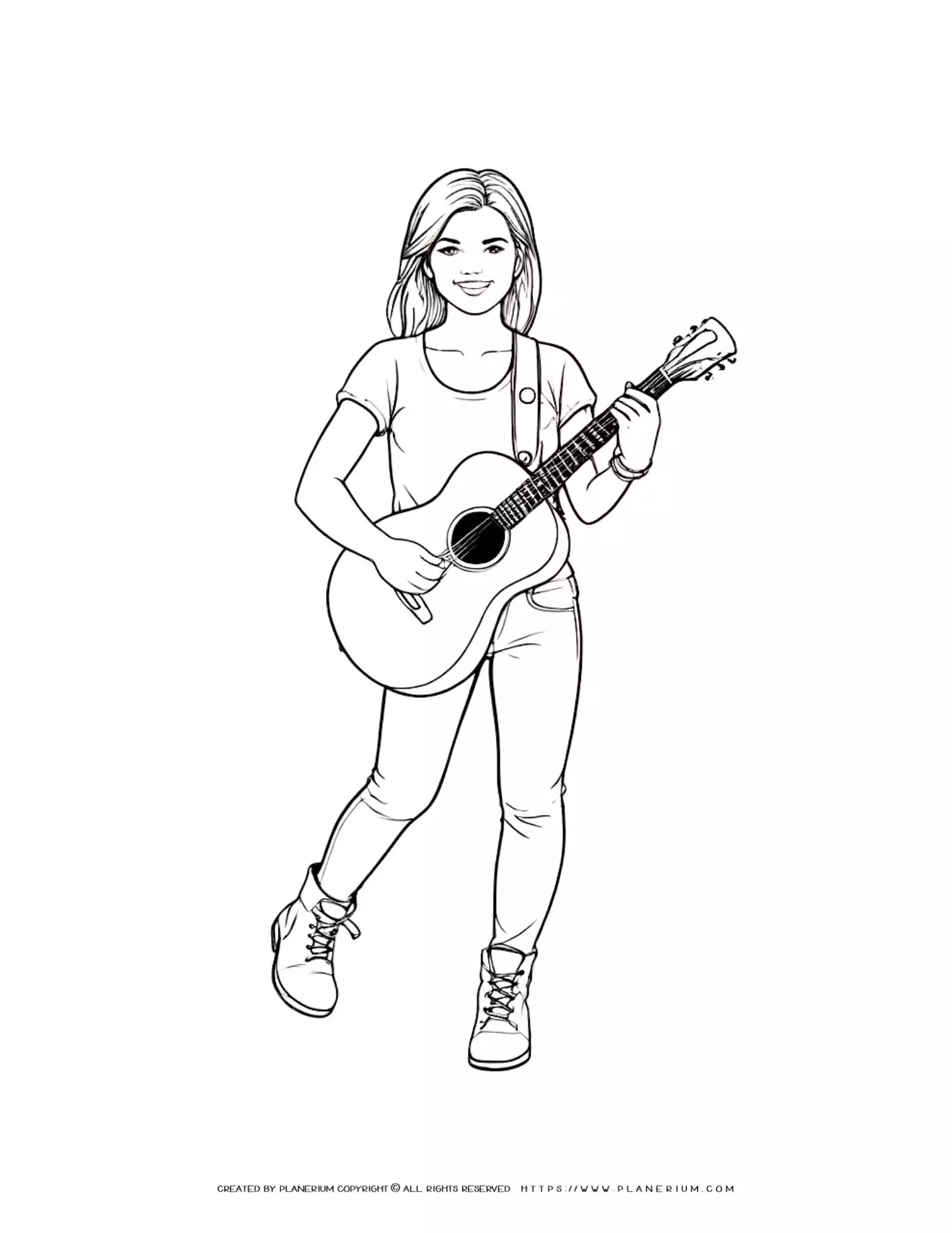The Female Playing Guitar Coloring Page is a versatile resource that fits seamlessly into various educational settings. Teachers can use it as an art activity to complement music lessons, while parents and homeschoolers can integrate it into their daily learning routines. Special educators will find it particularly useful for sensory and fine motor activities.