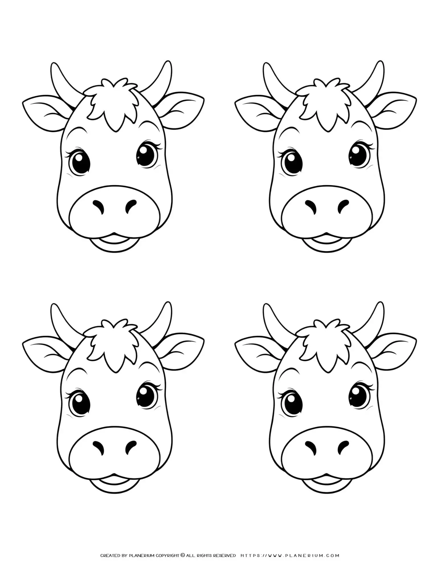 Four Baby Cow Faces Outlines Coloring Template for Creative Activities and Educational Fun!