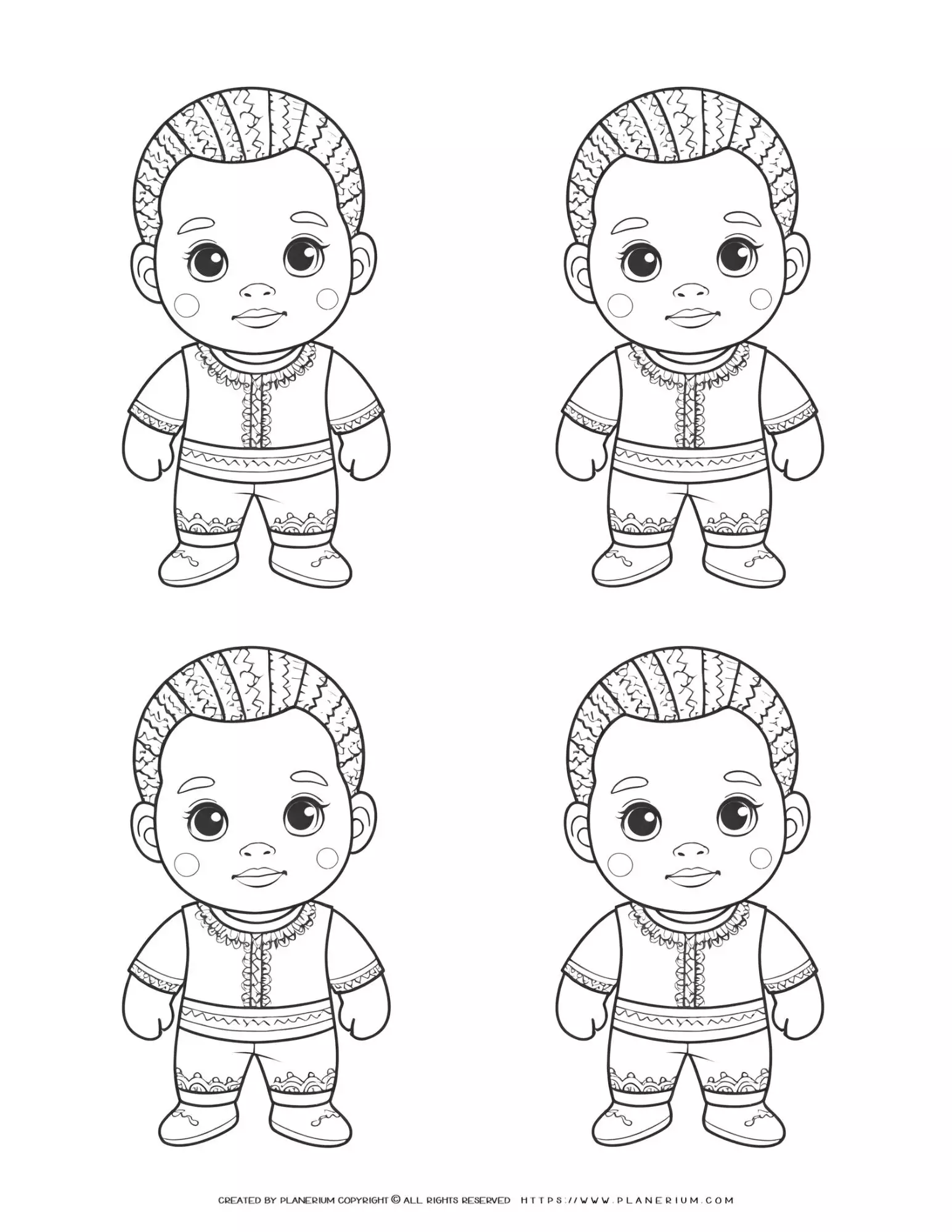 Four outline little African boys in traditional clothing for coloring and crafts activities at school or home.