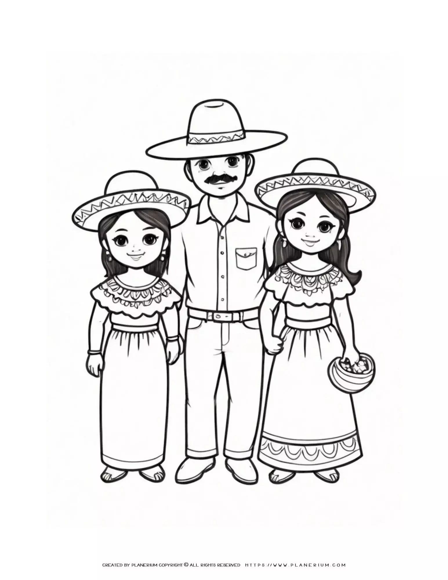 Free Printable Mexican Family Coloring Page for Kids: Father and Two Daughters Activity Sheet