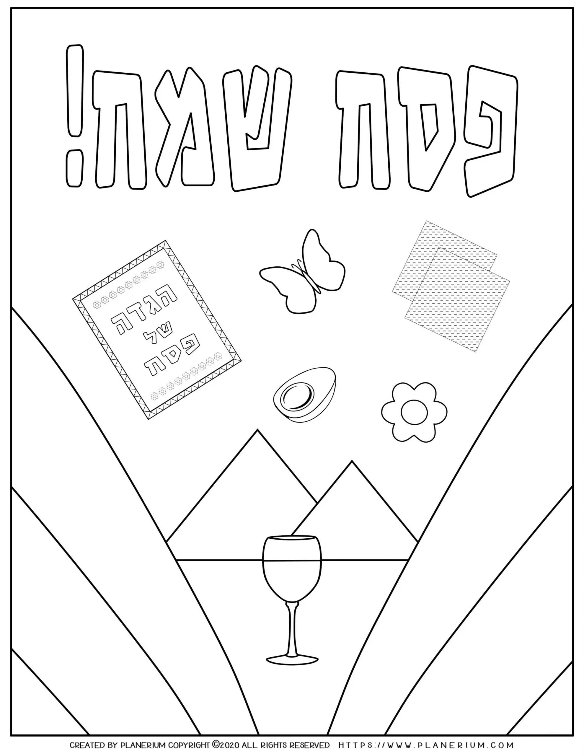 Coloring page for Passover with a “Happy Passover” title in Hebrew.