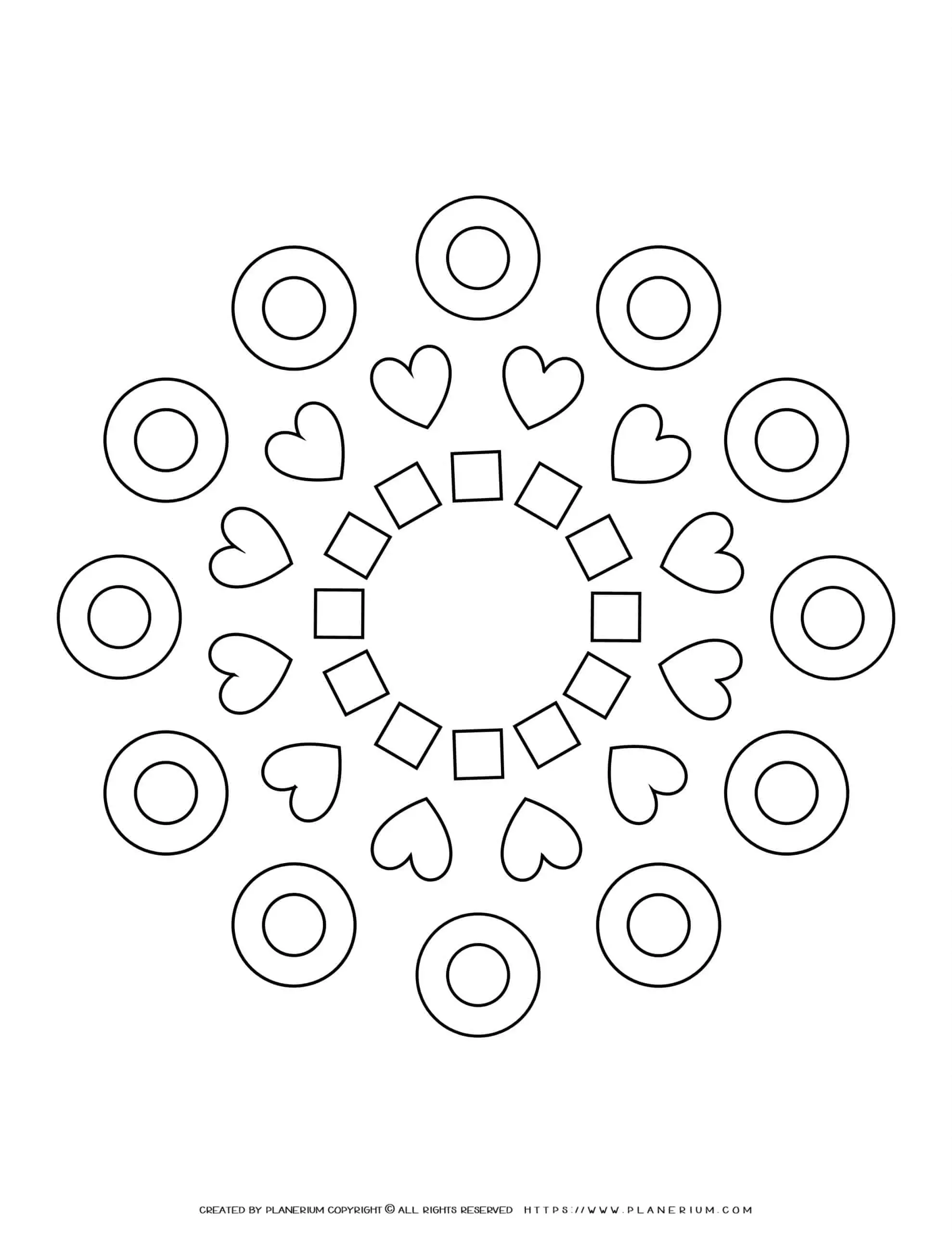 This page includes a basic mandala made from 12 rings, 12 hearts, and 12 squares.