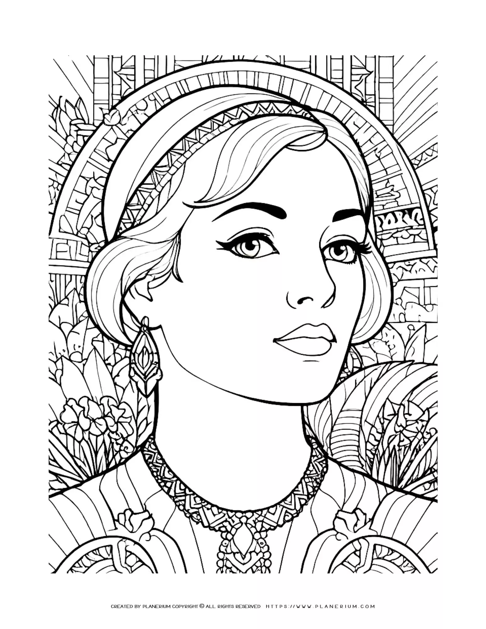 Intricate Art Deco Style Female Face Coloring Page with Detailed Background: Perfect for Relaxation and Creativity