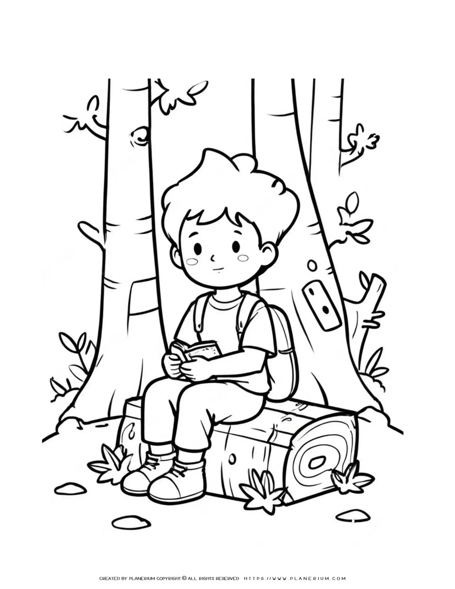 Feature a scene with little boy sitting and holding a book on a trunk in the forest illustration coloring page for kids. This magical scene engages children through a delightful blend of nature, adventure, and creativity. Whether you’re a teacher, parent, homeschooler, or special educator, this printable will become a beloved resource in your toolkit.