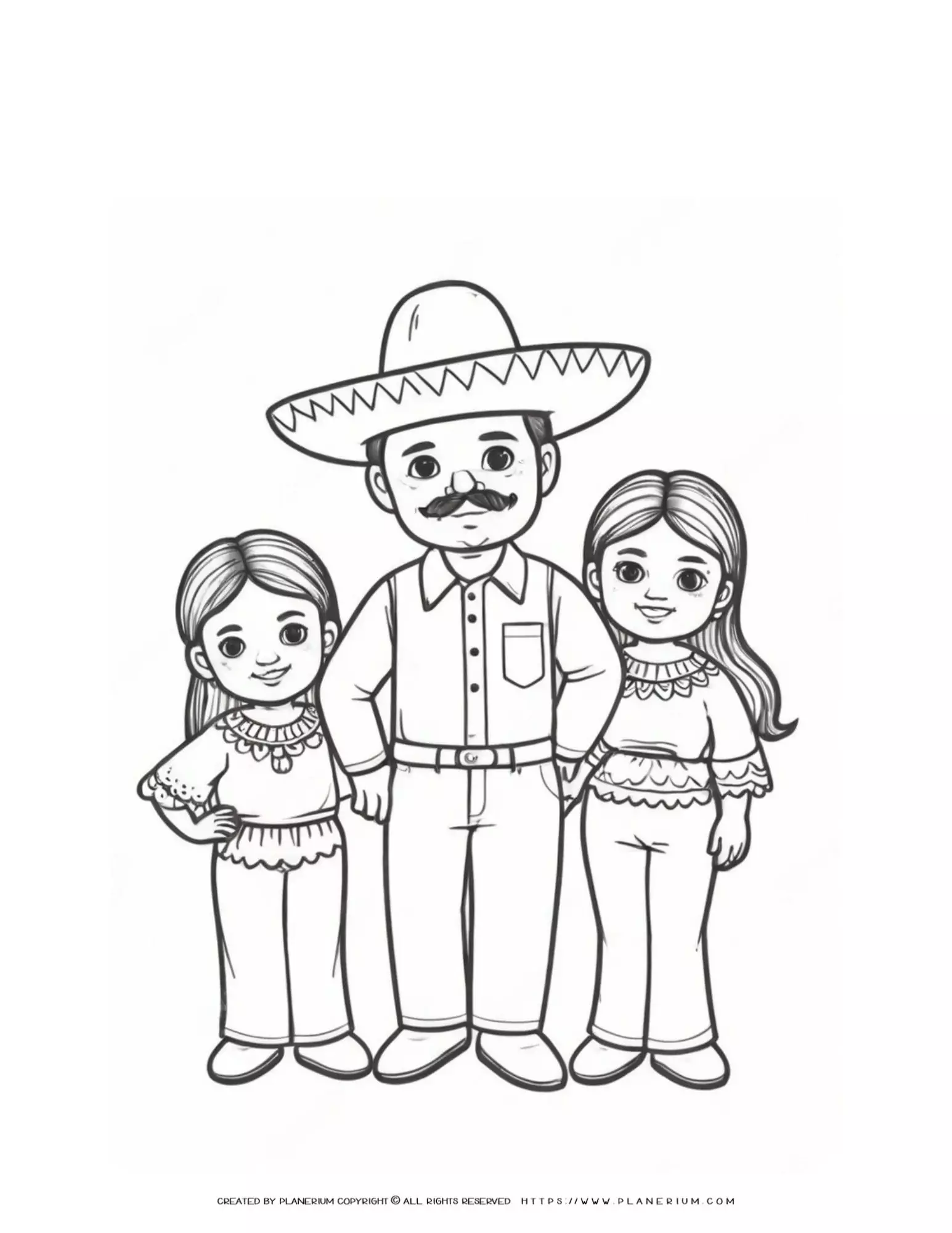 Mexican Family Bonding: Father and Two Daughters Coloring Page for Kids – Cultural Fun Activity Sheets