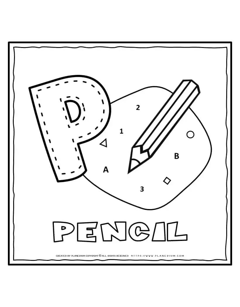 Letter P coloring page for kids with a pencil image and word.