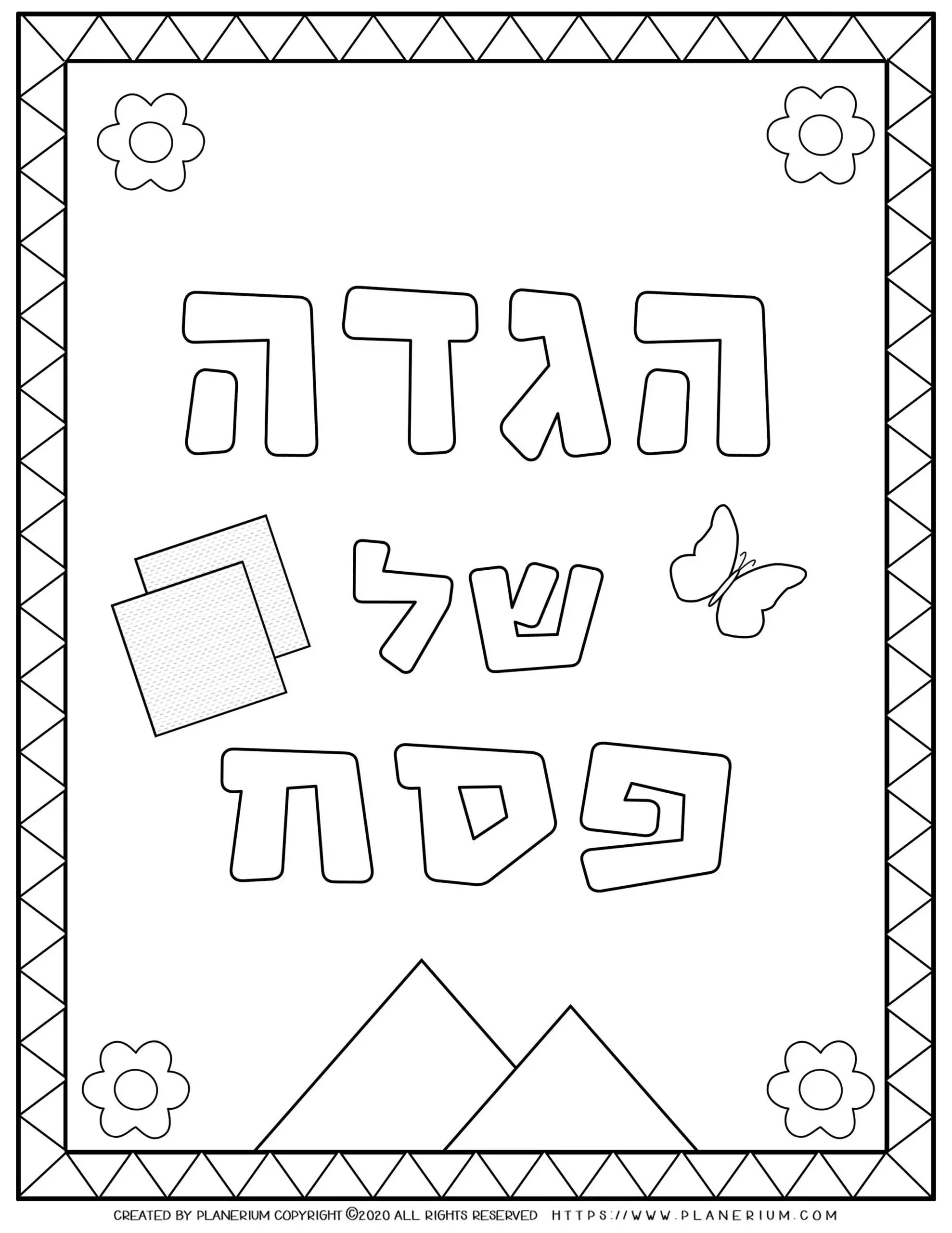 Coloring page for Passover with the Haggadah book cover in Hebrew.