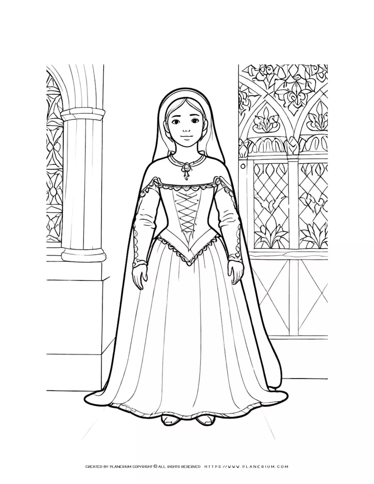 Renaissance Woman in Gown with Palace Interior Background Historical Illustration Coloring Page