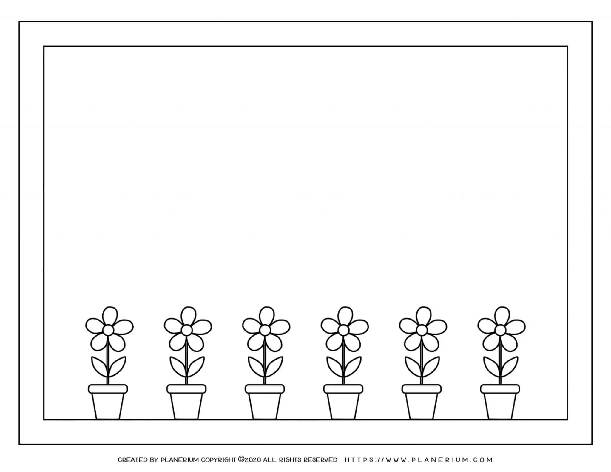 This printable features a charming flower-filled window with a decorative frame and six pots to color, label, or decorate. The simple lines make it accessible for preschoolers through elementary students; older kids can add patterns, shading, or write spring vocabulary around the frame.