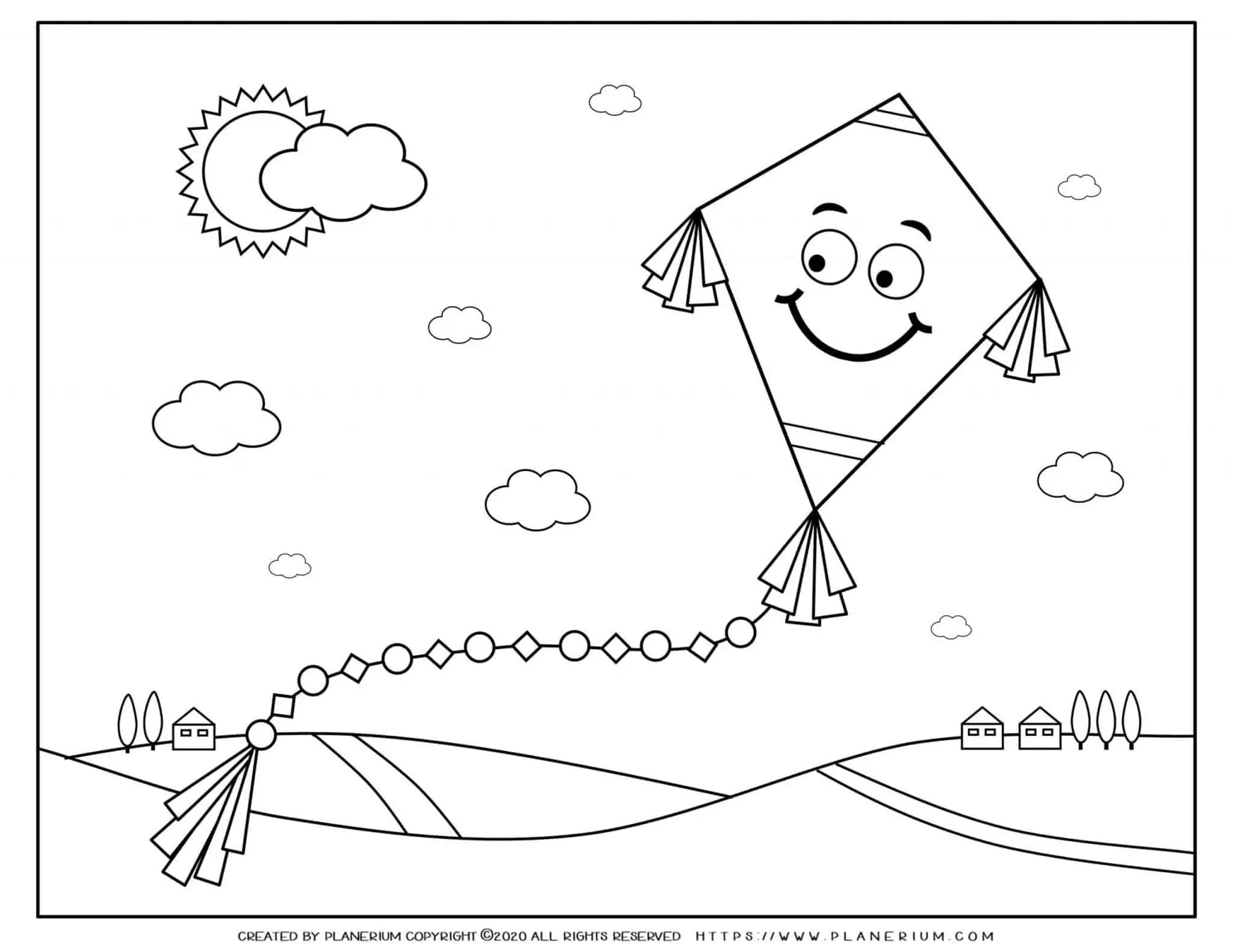 Spring coloring page with a smiling kite flying in the sky and in the background mountains and little houses.