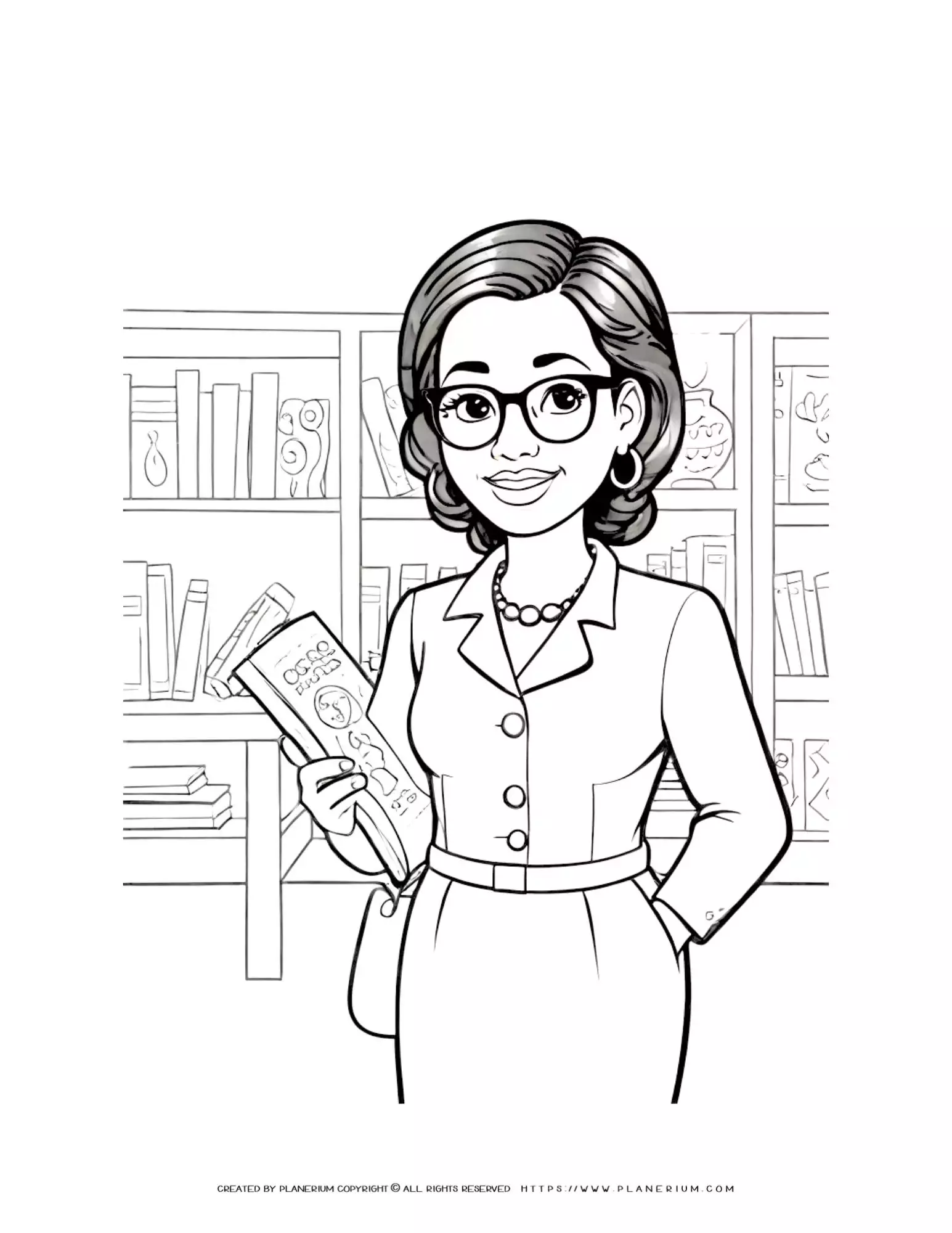 Teacher with Glasses in the Library Upper Body Illustration Coloring Page