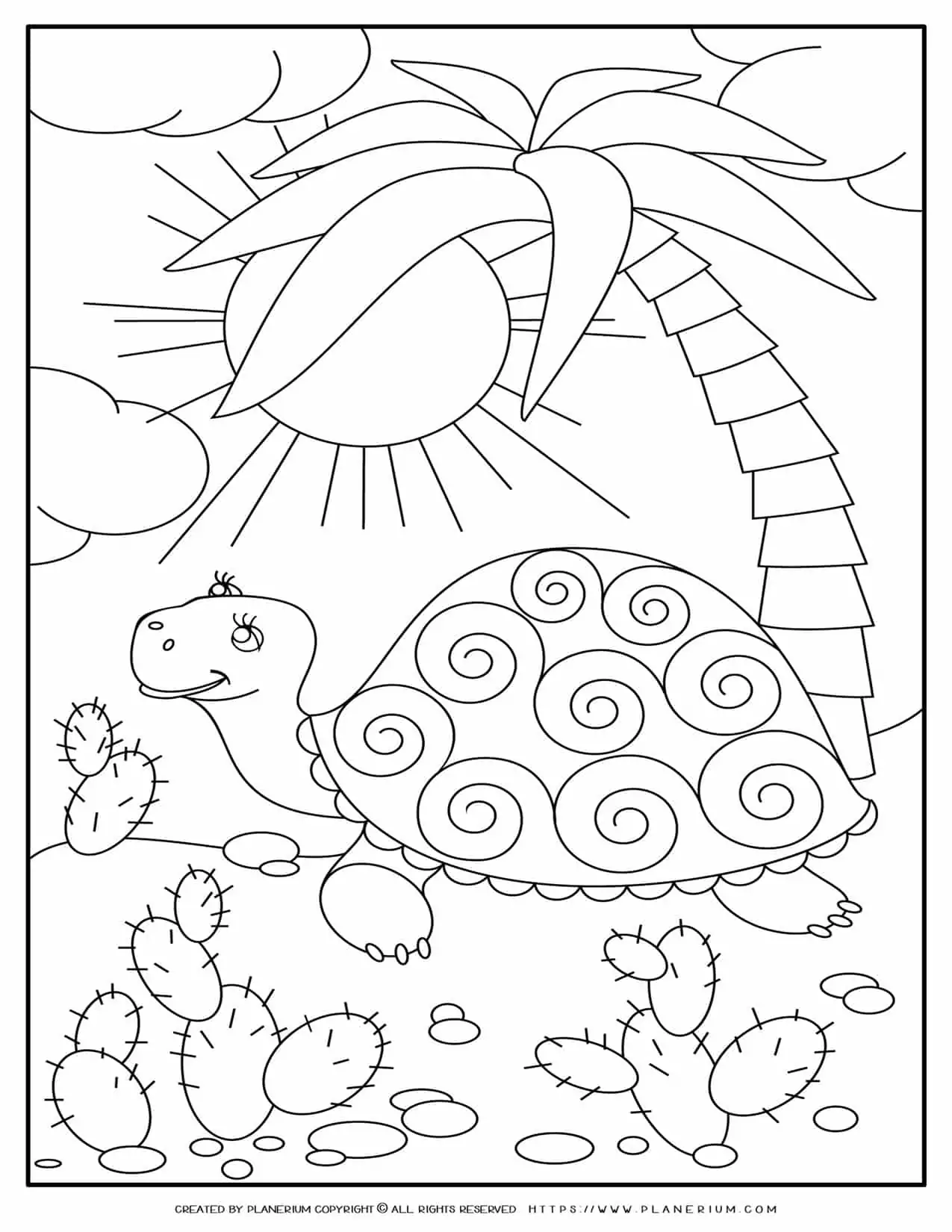 Coloring page with a smiling turtle next to a plum tree and some cactus on a sunny day.