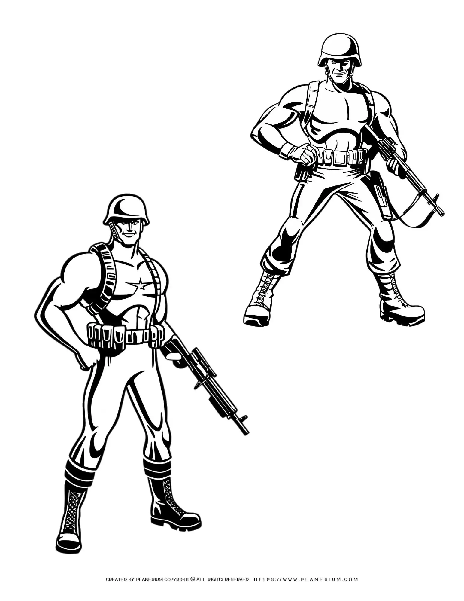Enhance your educational toolkit with this unique black and white illustration depicting two comic soldiers with guns in different poses. Designed to be versatile and engaging, this printable is ideal for a variety of educational and creative contexts.