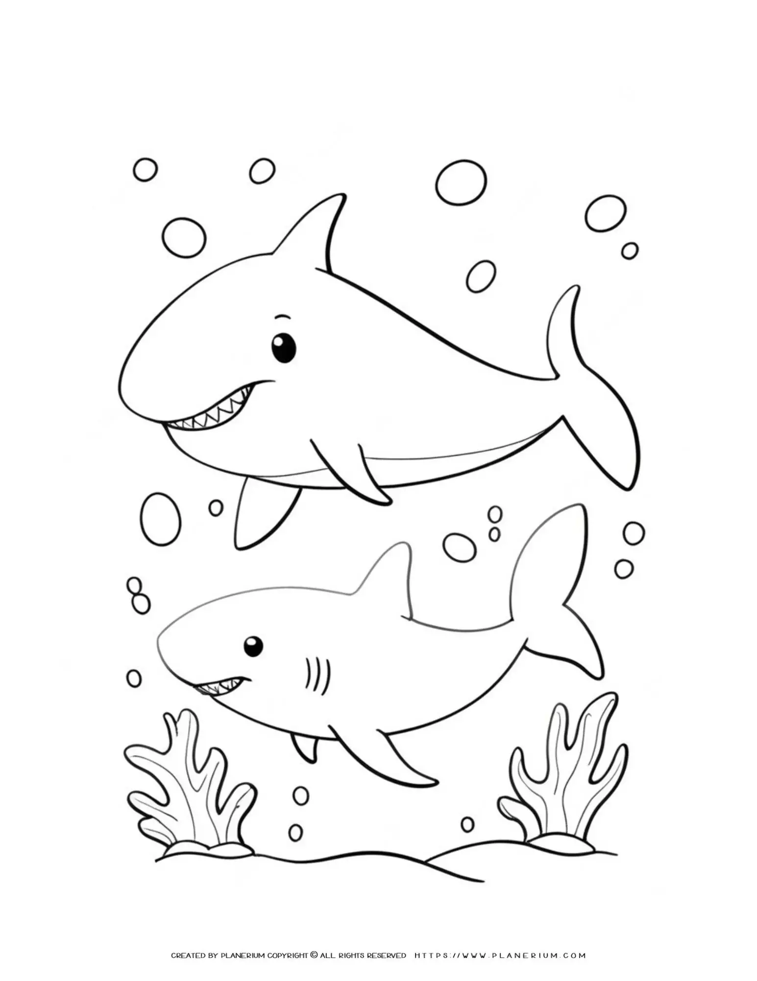 Underwater Adventure: Two Cartoon Sharks Coloring Page for Kids – Fun & Creative Ocean Theme Activity