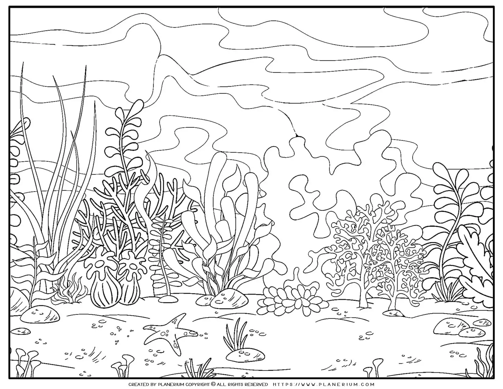 Coloring page with an underwater view. Bottom of the sea illustration with water plants and starfish.