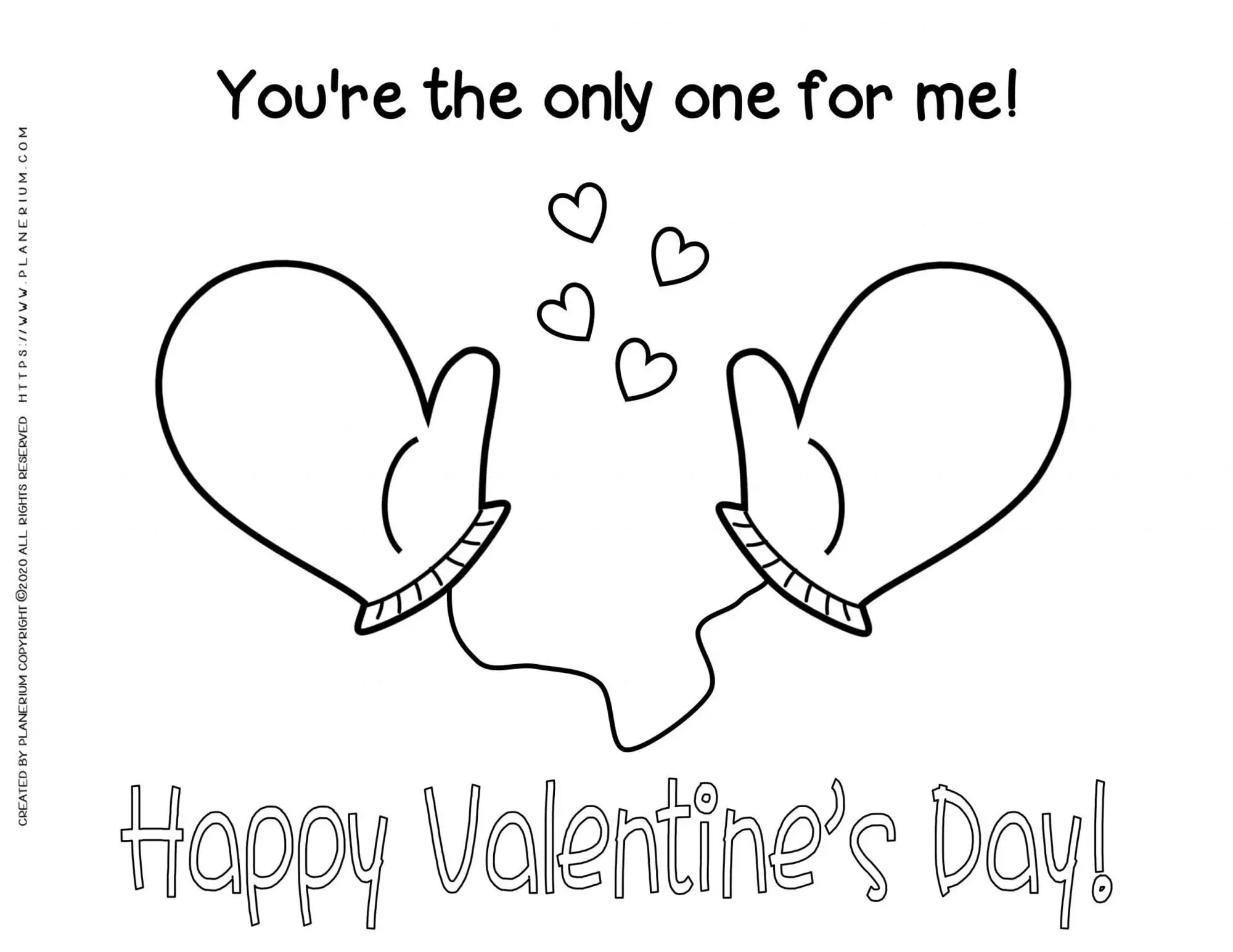 This free printable coloring-page features two friendly gloves surrounded by hearts, a large “Happy Valentine’s Day” title, and a sweet secondary greeting: “You’re the only one for me!” Designed for teachers, parents, and homeschoolers, it’s an easy, low-prep art activity that builds fine motor skills, creativity, and vocabulary about kindness and love.