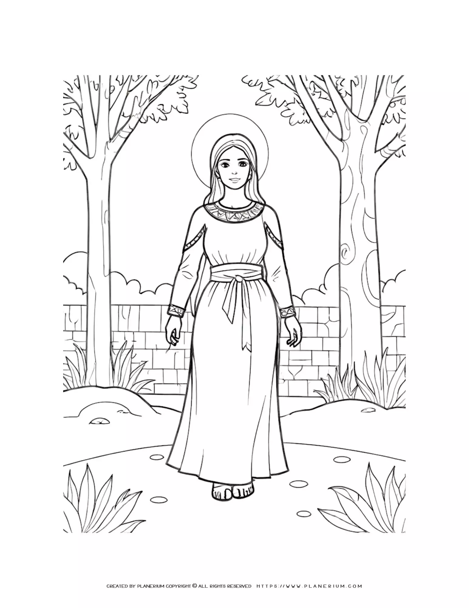 Woman in Biblical Robe with Garden Background Historical Illustration Coloring Page