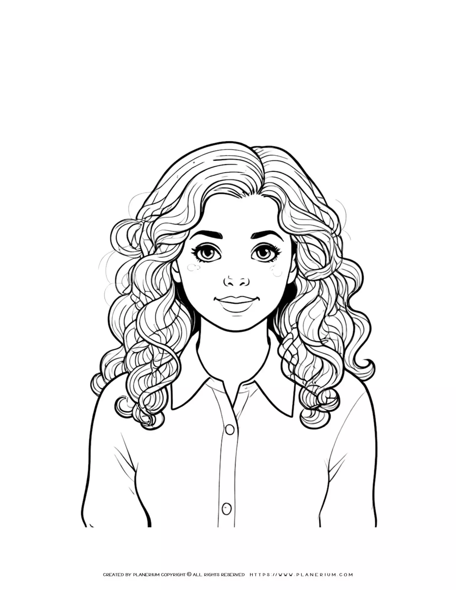 Young Woman Torso with Curly Hair Front View Illustration Coloring Page
