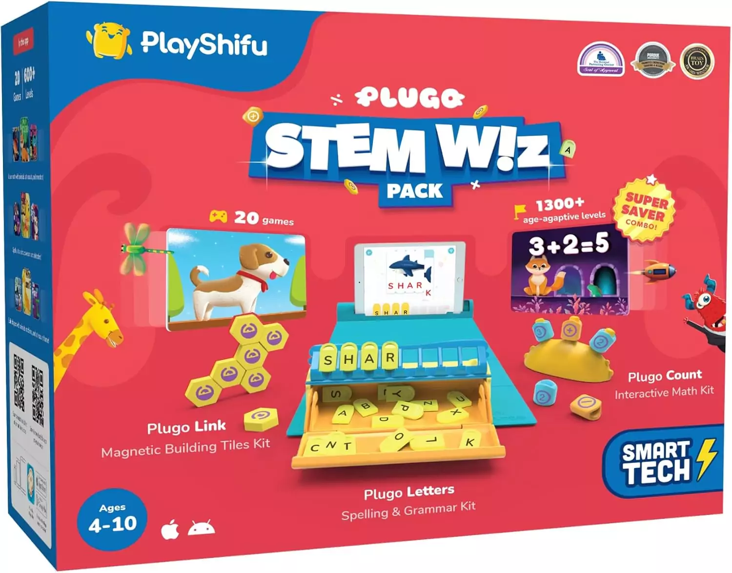 The PlayShifu Plugo STEM Pack 3-in-1 Wiz Pack seamlessly integrates learning with play, making it the perfect educational tool for children aged 4 to 10. This innovative kit features Plugo Count, Plugo Letters, and Plugo Link, which are designed to enhance various essential skills through engaging, interactive games that hold kids’ attention while they learn.