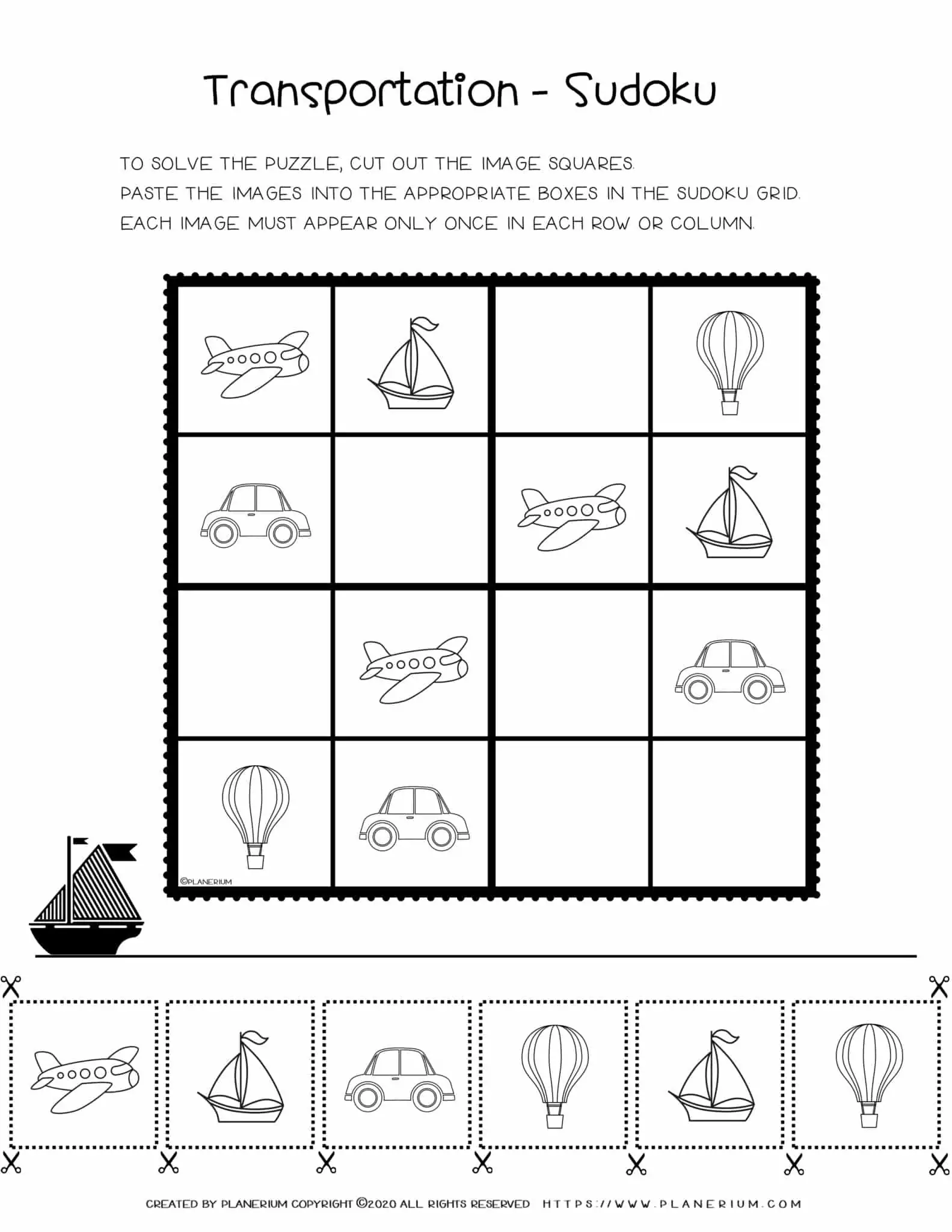 Transportation image sudoku game for kids, with different types of vehicles images.